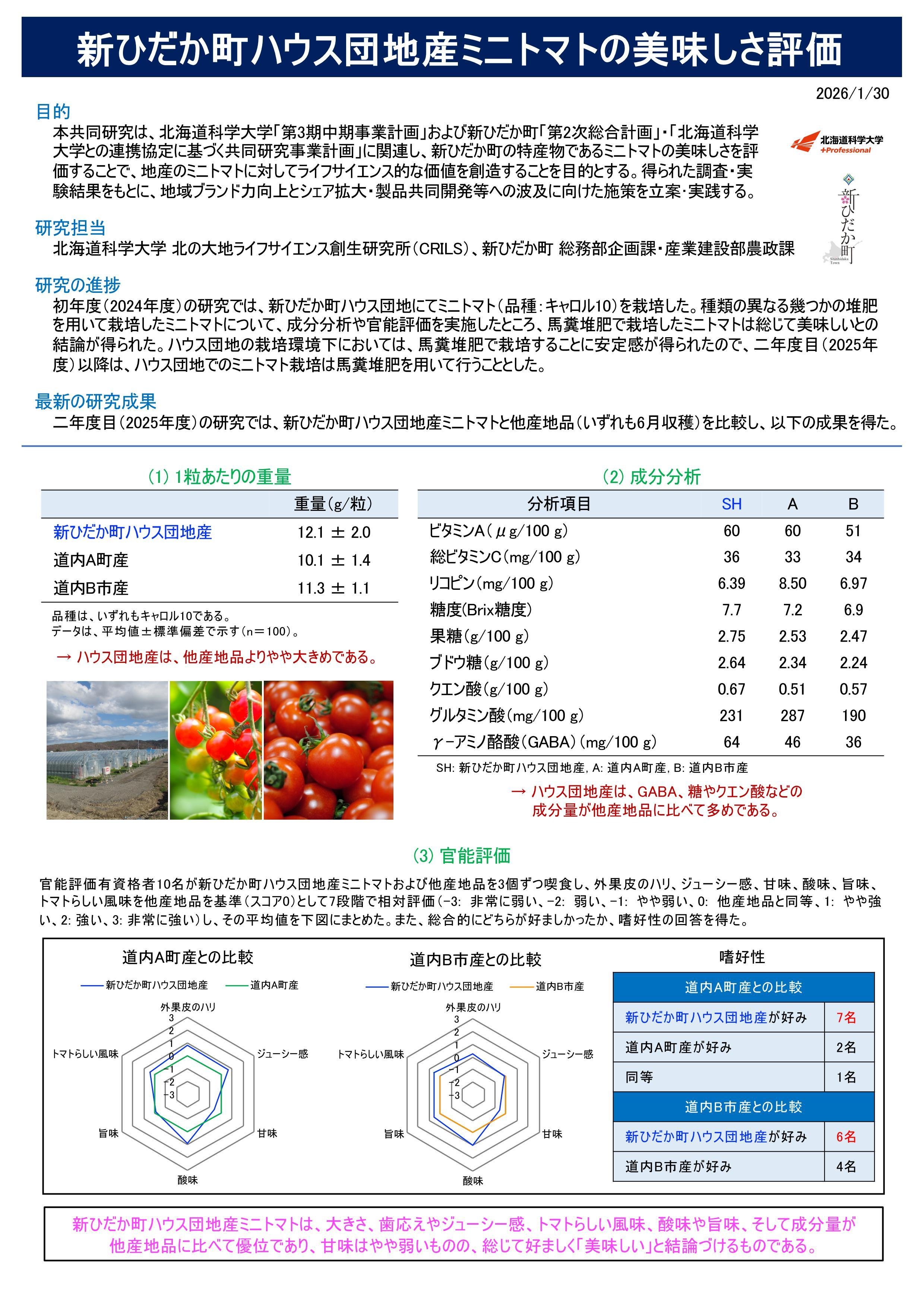 本研究は、本学と新ひだか町の連携協定に基づく共同研究として、新ひだか町ハウス団地産ミニトマトの美味しさを科学的に評価したものです。