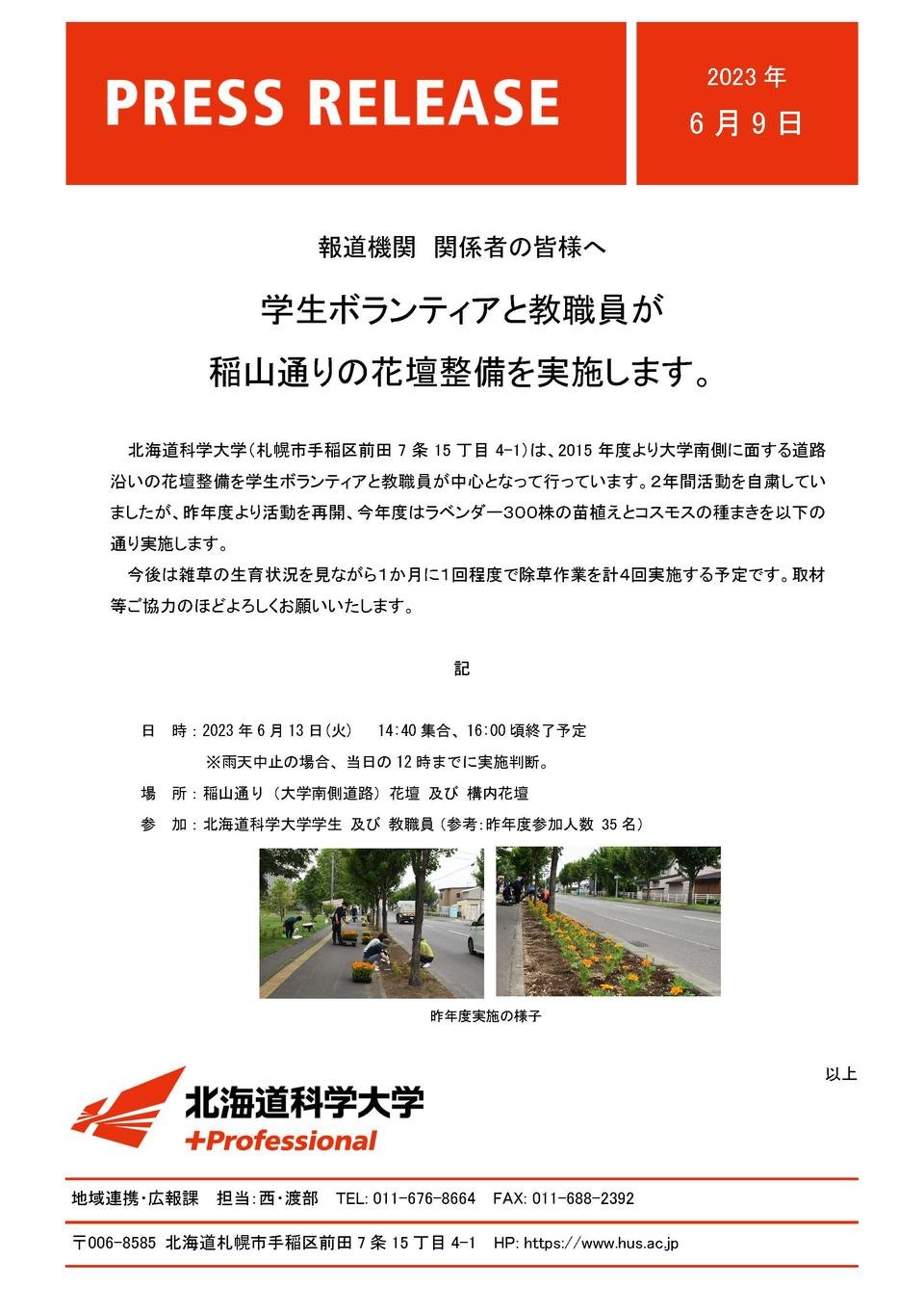 北海道科学大学(札幌市手稲区前田7条15丁目4-1)は、2015年度より大学南側に面する道路沿いの花壇整備を学生ボランティアと教職員が中心となって行っています。