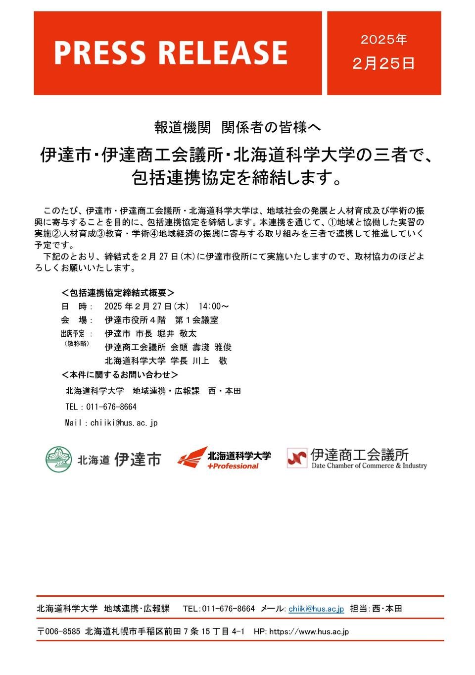 下記のとおり、締結式を2月27日(木)に伊達市役所にて実施いたしますので、取材協力のほどよろしくお願いいたします。