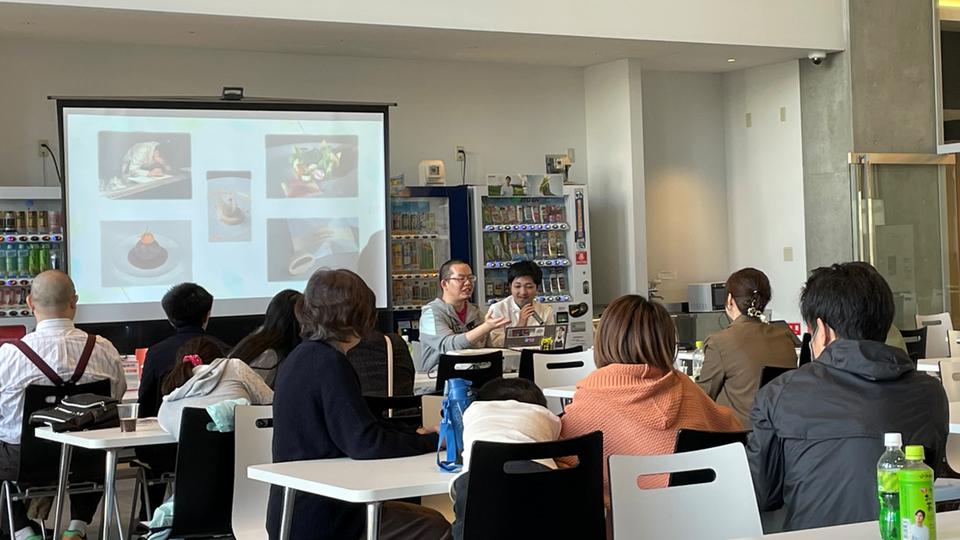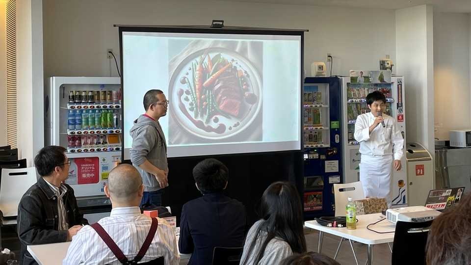 今回の講座では料理×科学の内容で行うトークセッションやシェフのエンターテイメント性あふれる料理技術の講演、生成AIを利用した料理レシピを考案するワークショップ及び実食という内容で実施しました。