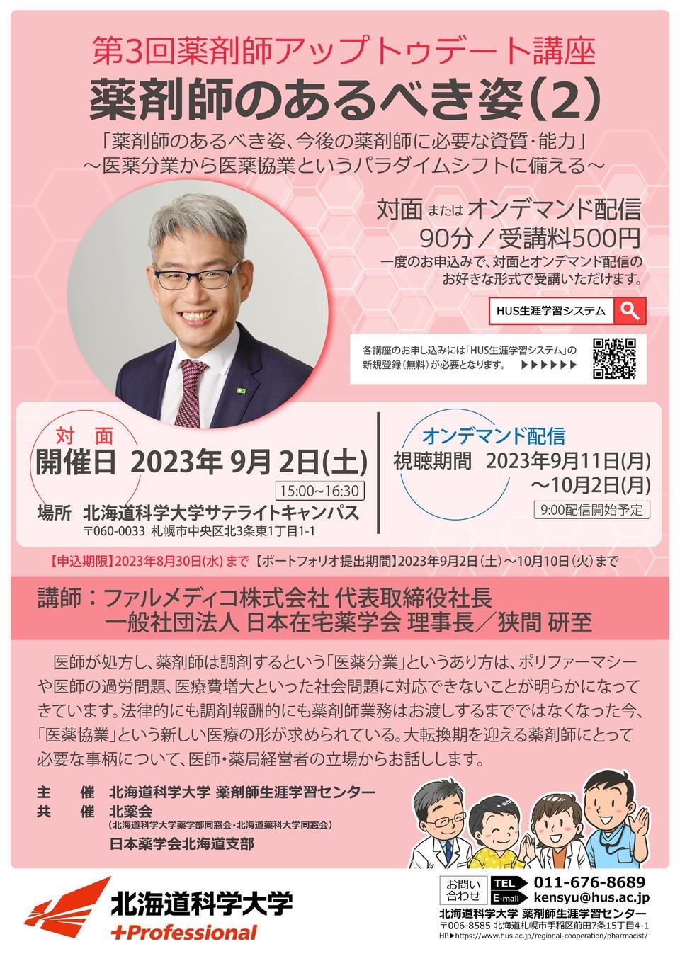 2023年9月2日(土)、北海道科学大学 薬剤師生涯学習センター主催講座【第3回薬剤師アップトゥデート講座】を開催いたします。