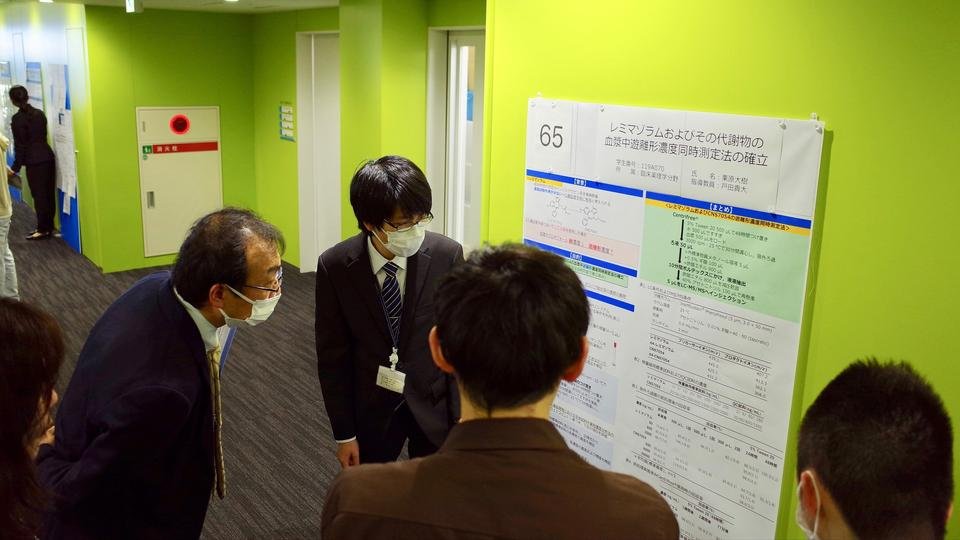 基礎薬学、応用薬学、臨床薬学、社会薬学、薬学教育の各部門内の様々な研究ゼミに属する卒業研究生が、4年生から取り組んできた研究についてその成果を発表しました。