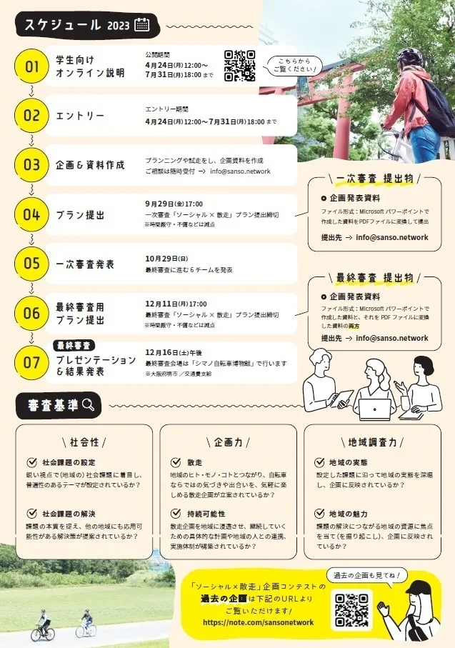 「ソーシャル×散走」企画コンテストは、エコな乗り物である自転車で、地域の魅力やストーリーを楽しむ散走は人や地域に優しい暮らしに通じているという考えのもと、株式会社シマノ主催により、社会課題の解決に関心の高い学生を募り、”環境・交流・健康”をテーマに持続可能な地域社会を育む散走企画を募集し実施しているものです。