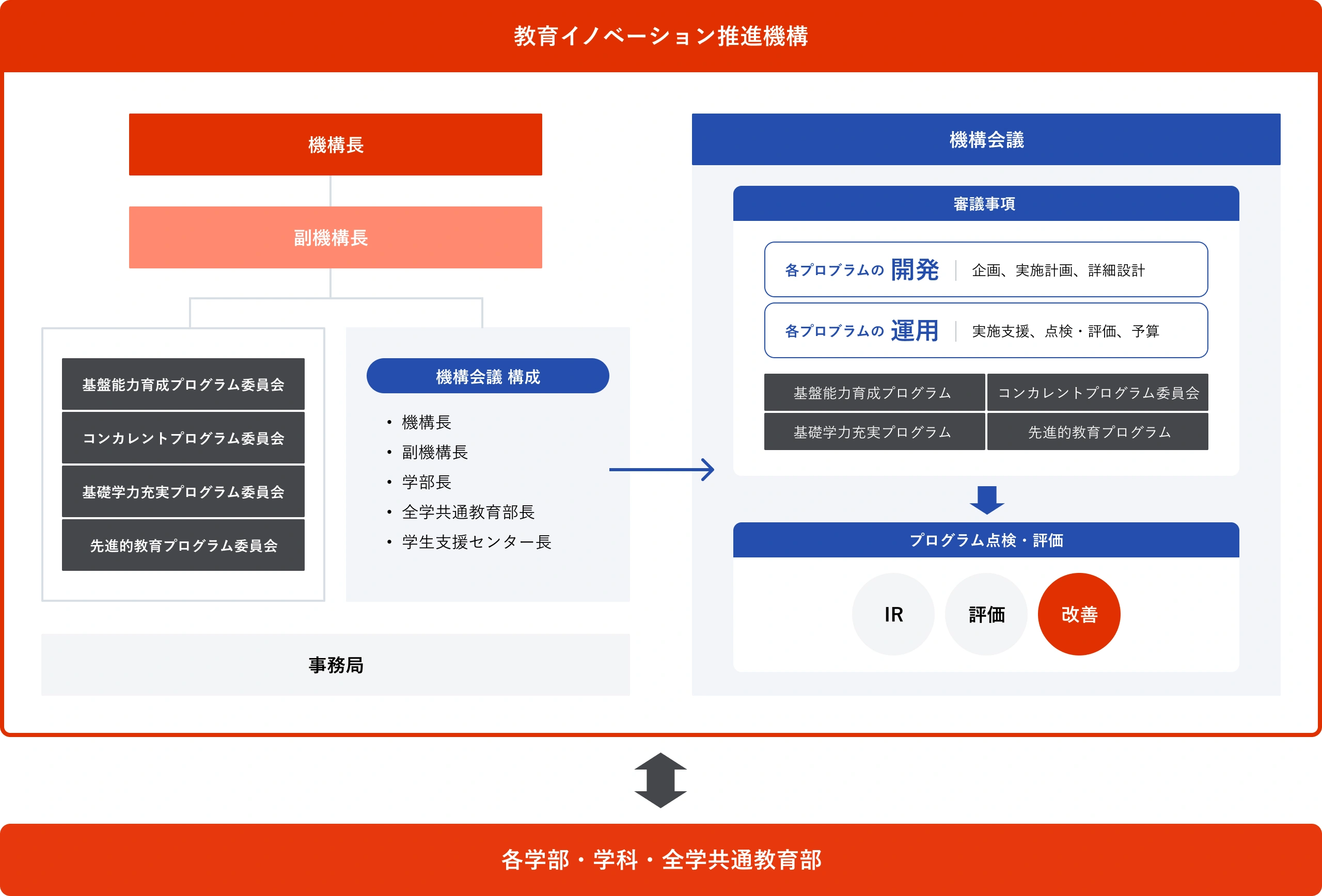 教育イノベーション推進機構は、本学の建学の精神を教育システムとして体現し、真の「+Professional」人材を育成するための教育イノベーションを推進するために設置されました。