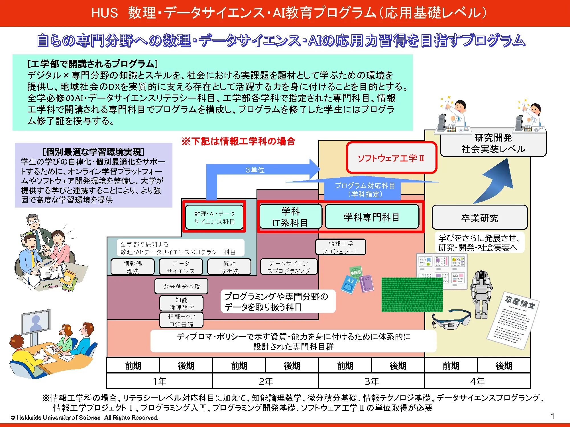 - 情報処理法、統計分析法、データサイエンス、AI入門の4科目7単位の単位取得