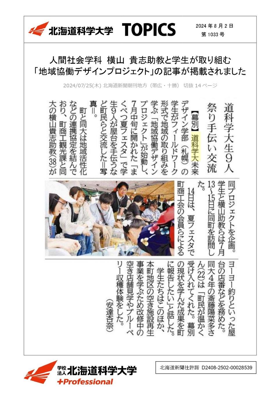 メディア掲載2024年08月02日人間社会学科 横山 貴志助教と学生が取り組む「地域協働デザインプロジェクト」の記事が掲載されました2024年08月01日北海道新聞道科学大生9人 祭り手伝い交流記事はこちらこの記事をSNSでシェアXでシェアするLINEでシェアする