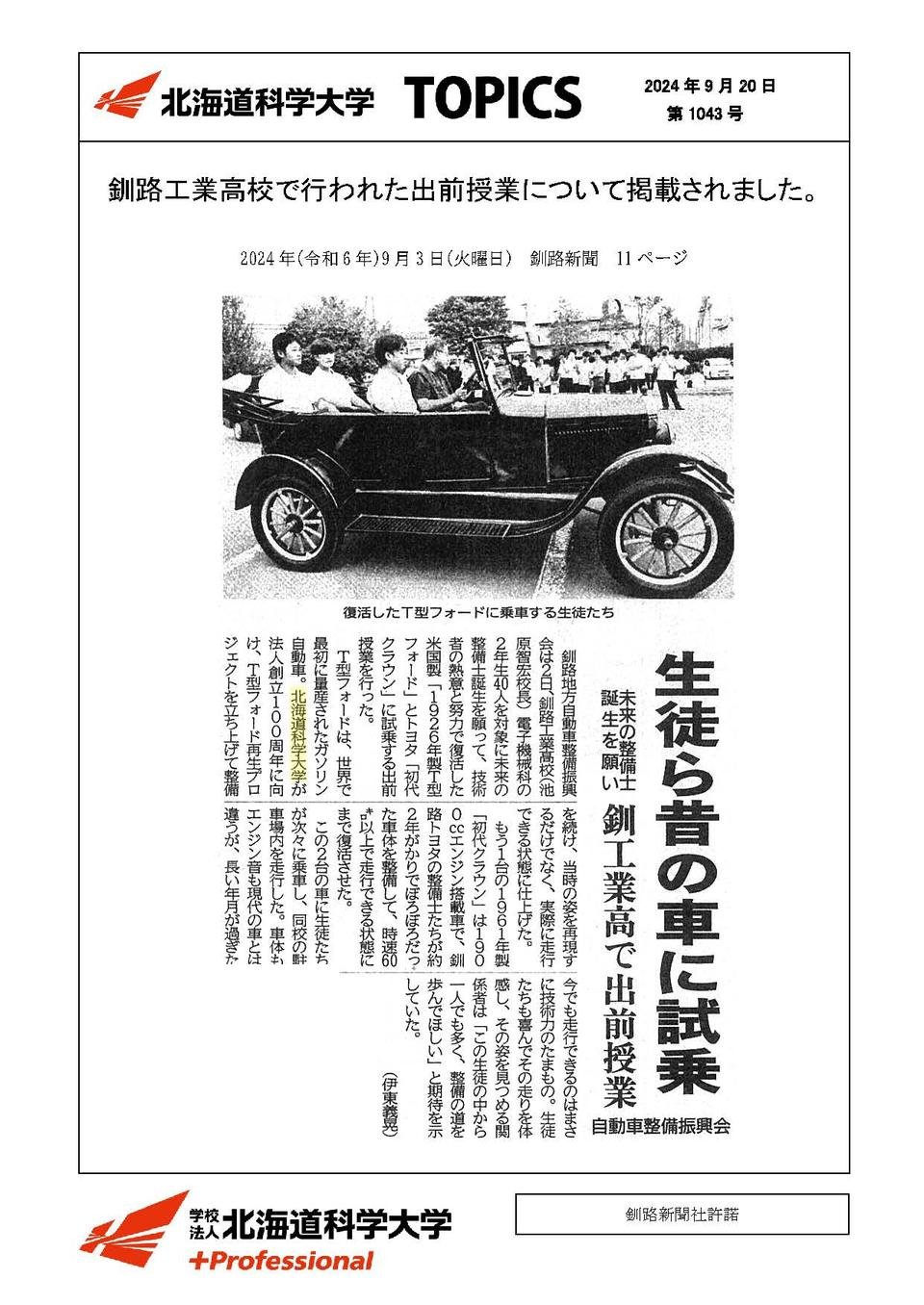 メディア掲載2024年09月20日釧路工業高校で行われた出前授業について新聞に掲載されました2024年09月03日釧路新聞生徒ら昔の車に試乗(11面)記事はこちらこの記事をSNSでシェアXでシェアするLINEでシェアする