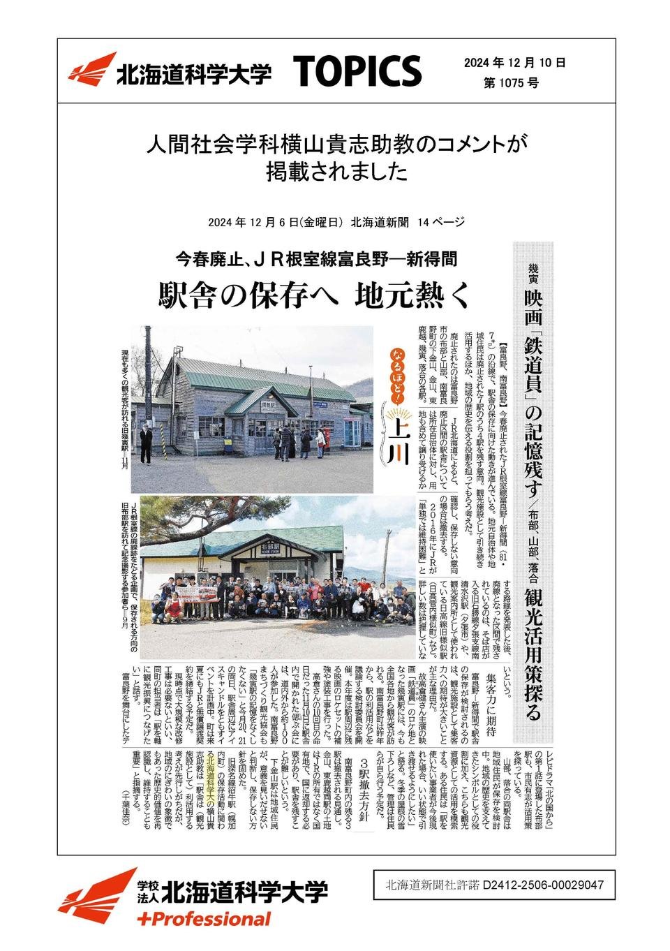 工学部メディア掲載2024年12月10日人間社会学科横山貴志助教のコメントが掲載されました2024年12月06日北海道新聞駅舎の保存へ 地元熱く(14面)記事はこちらこの記事をSNSでシェアXでシェアするLINEでシェアする