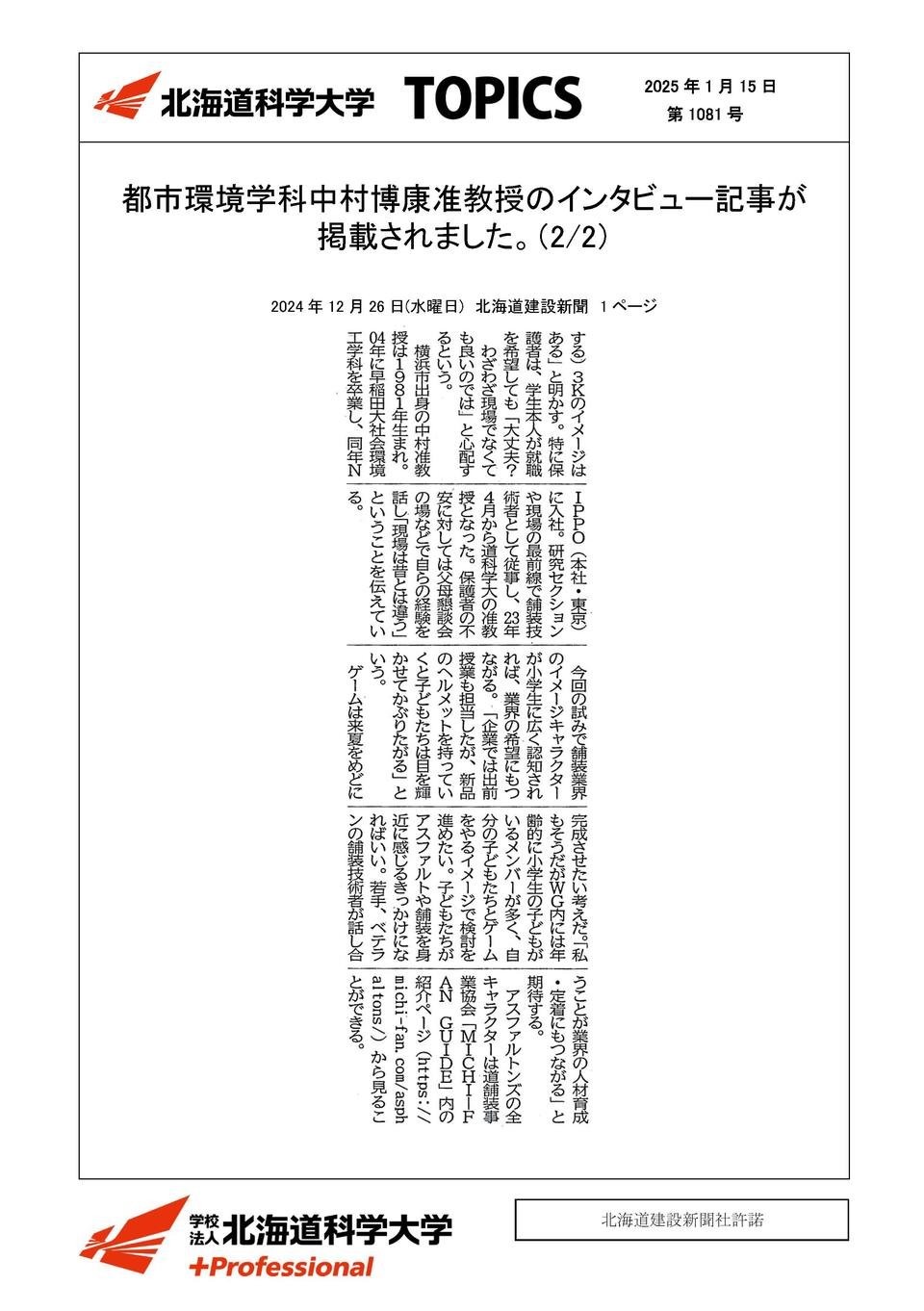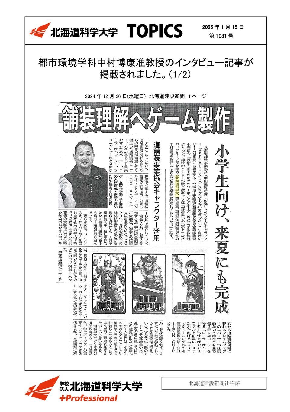 工学部メディア掲載2025年01月15日都市環境学科中村博康准教授のインタビュー記事が掲載されました2024年12月26日北海道建設新聞舗装理解へゲーム製作(1面)記事はこちら(1/2)記事はこちら(2/2)この記事をSNSでシェアXでシェアするLINEでシェアする