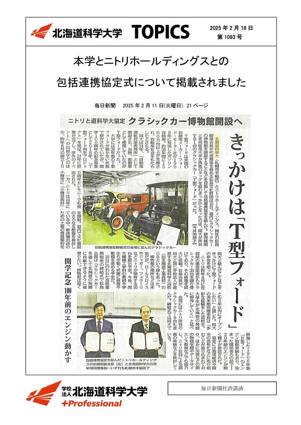 メディア掲載地域連携2025年02月18日本学とニトリホールディングスとの包括連携協定式について掲載されました2025年02月11日毎日新聞きっかけは「T型フォード」(21面)記事はこちら興味を持ったら・・・T型フォード再生プロジェクト 特設サイトこの記事をSNSでシェアXでシェアするLINEでシェアする