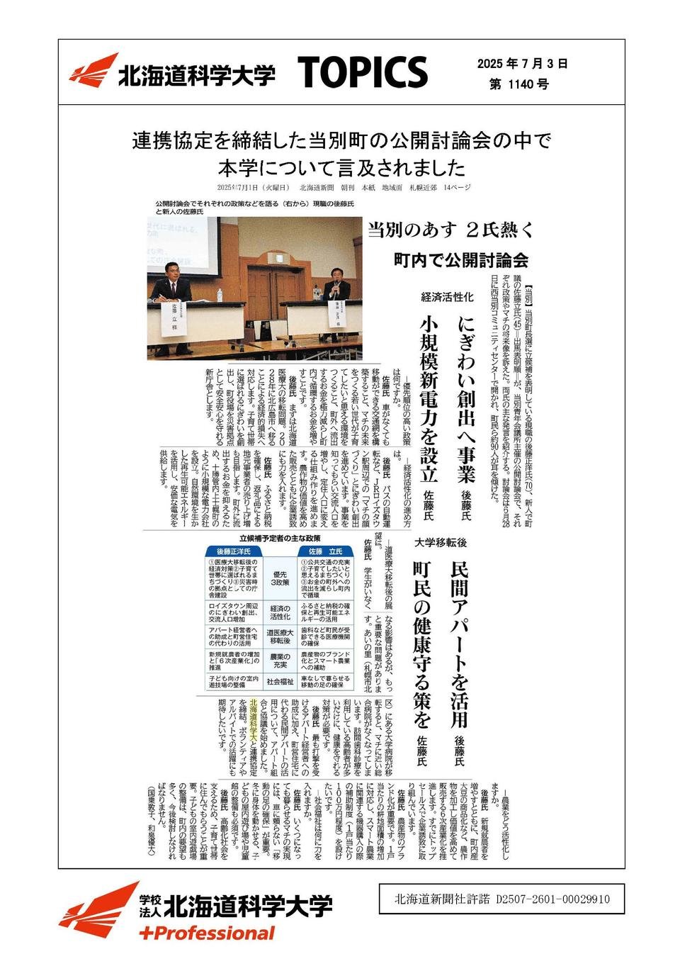メディア掲載2025年07月03日連携協定を締結した当別町の公開討論会の中で本学について言及されました2025年07月01日北海道新聞当別のあす 2氏熱く(14面)記事はこちらこの記事をSNSでシェアXでシェアするLINEでシェアする