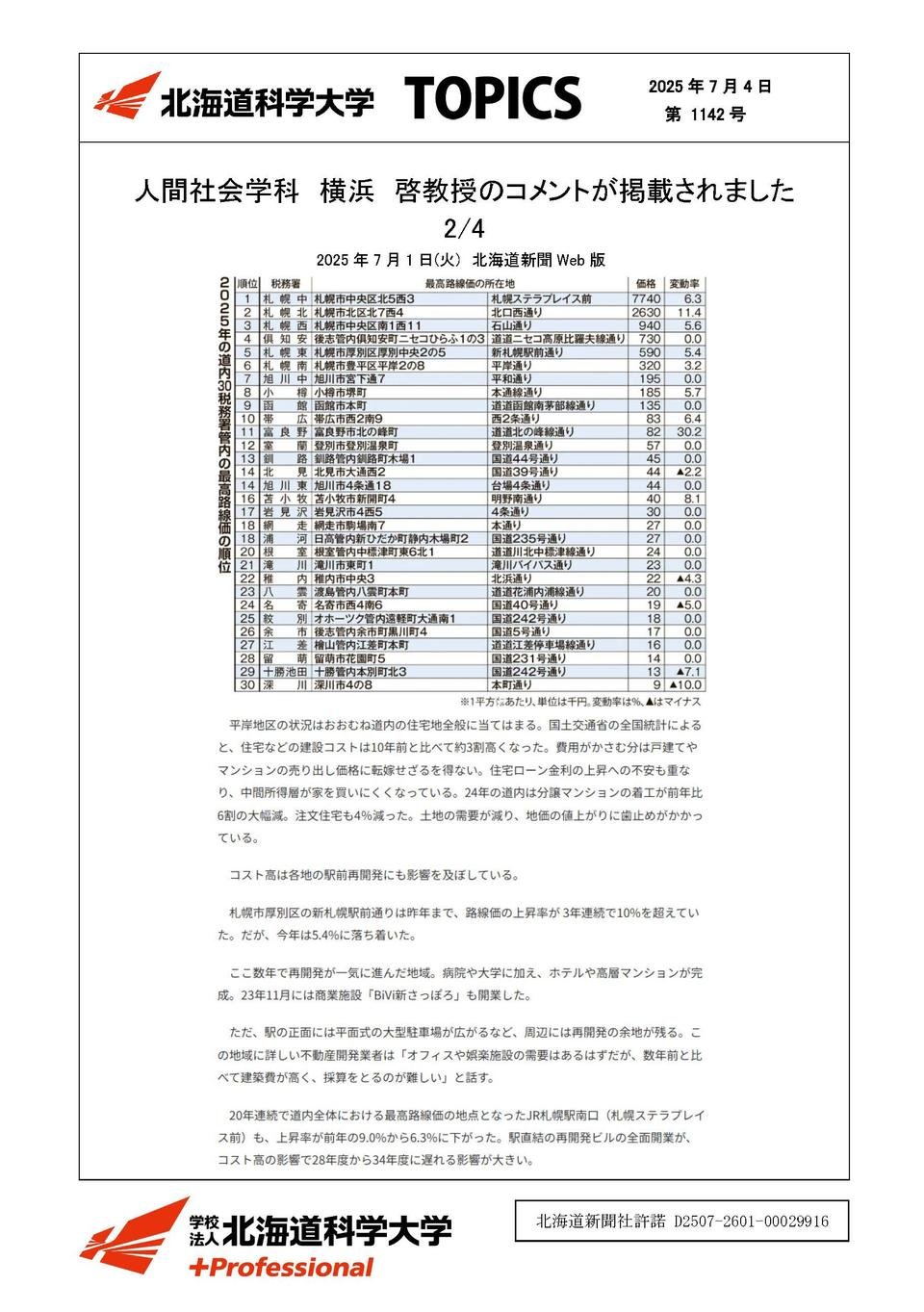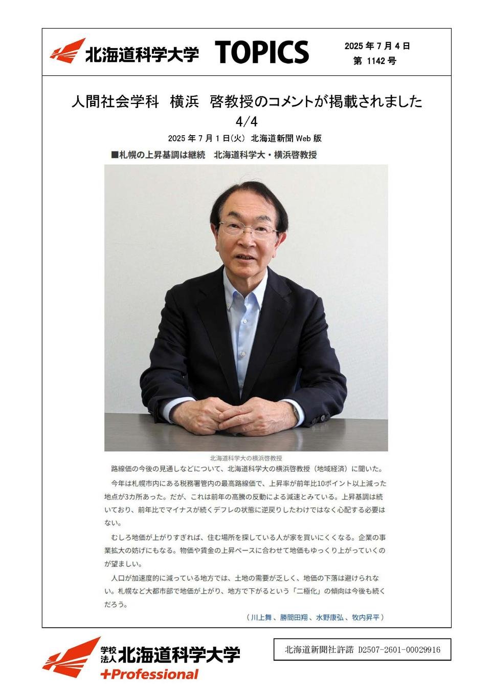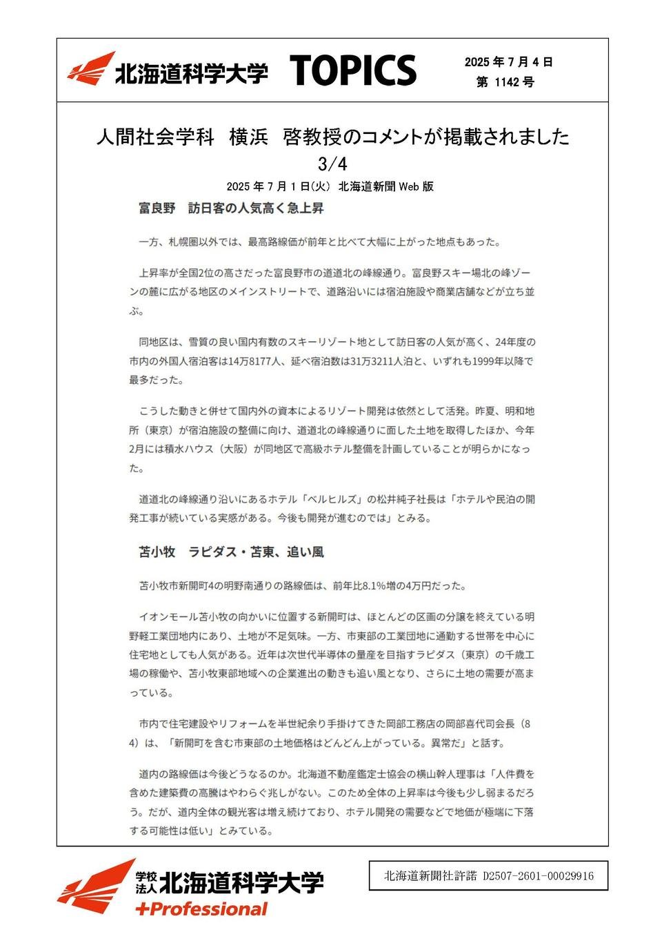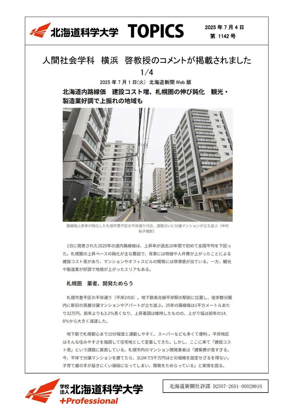 未来デザイン学部メディア掲載2025年07月04日人間社会学科 横浜 啓教授のコメントが掲載されました2025年07月01日北海道新聞Web版未来デザイン学部 人間社会学科横浜 啓 教授北海道内路線価 建設コスト増、札幌圏の伸び鈍化 観光・製造業好調で上振れの地域も記事はこちら1/4記事はこちら2/4記事はこちら3/4記事はこちら4/4この記事をSNSでシェアXでシェアするLINEでシェアする