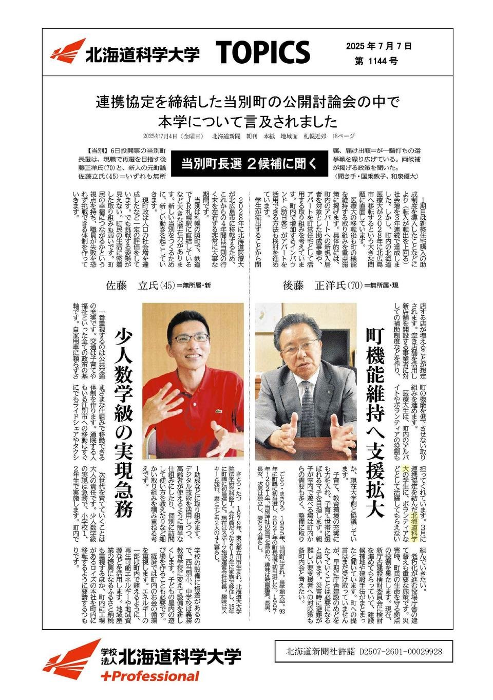 メディア掲載2025年07月07日連携協定を締結した当別町の公開討論会の中で本学について言及されました(2025年7月4日)2025年07月04日北海道新聞当別町長選 2候補に聞く(18面)記事はこちらこの記事をSNSでシェアXでシェアするLINEでシェアする