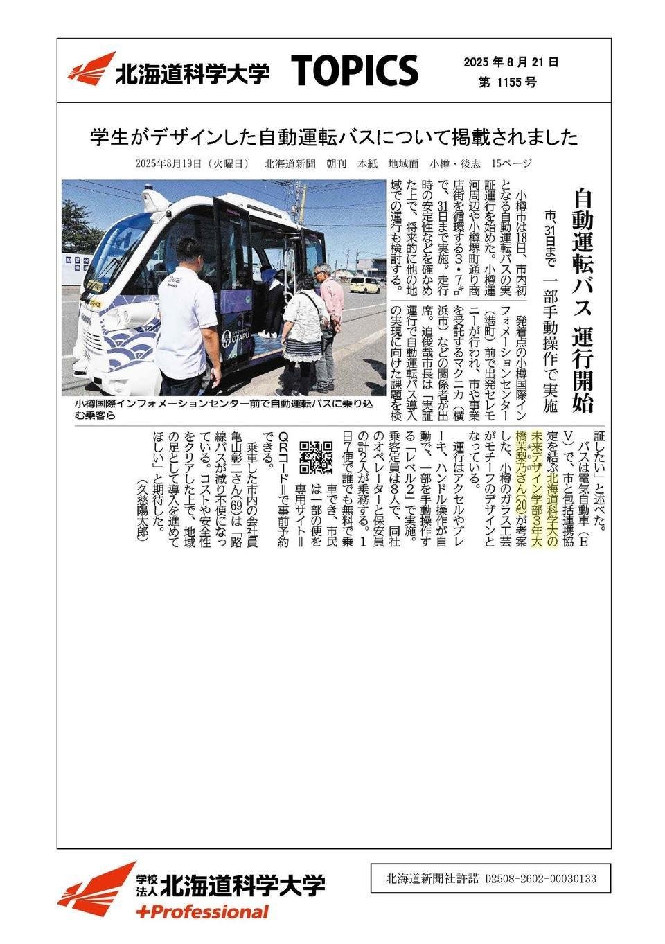メディア掲載2025年08月21日学生がデザインした自動運転バスについて掲載されました2025年08月19日北海道新聞自動運転バス 運行開始(15面)記事はこちらこの記事をSNSでシェアXでシェアするLINEでシェアする