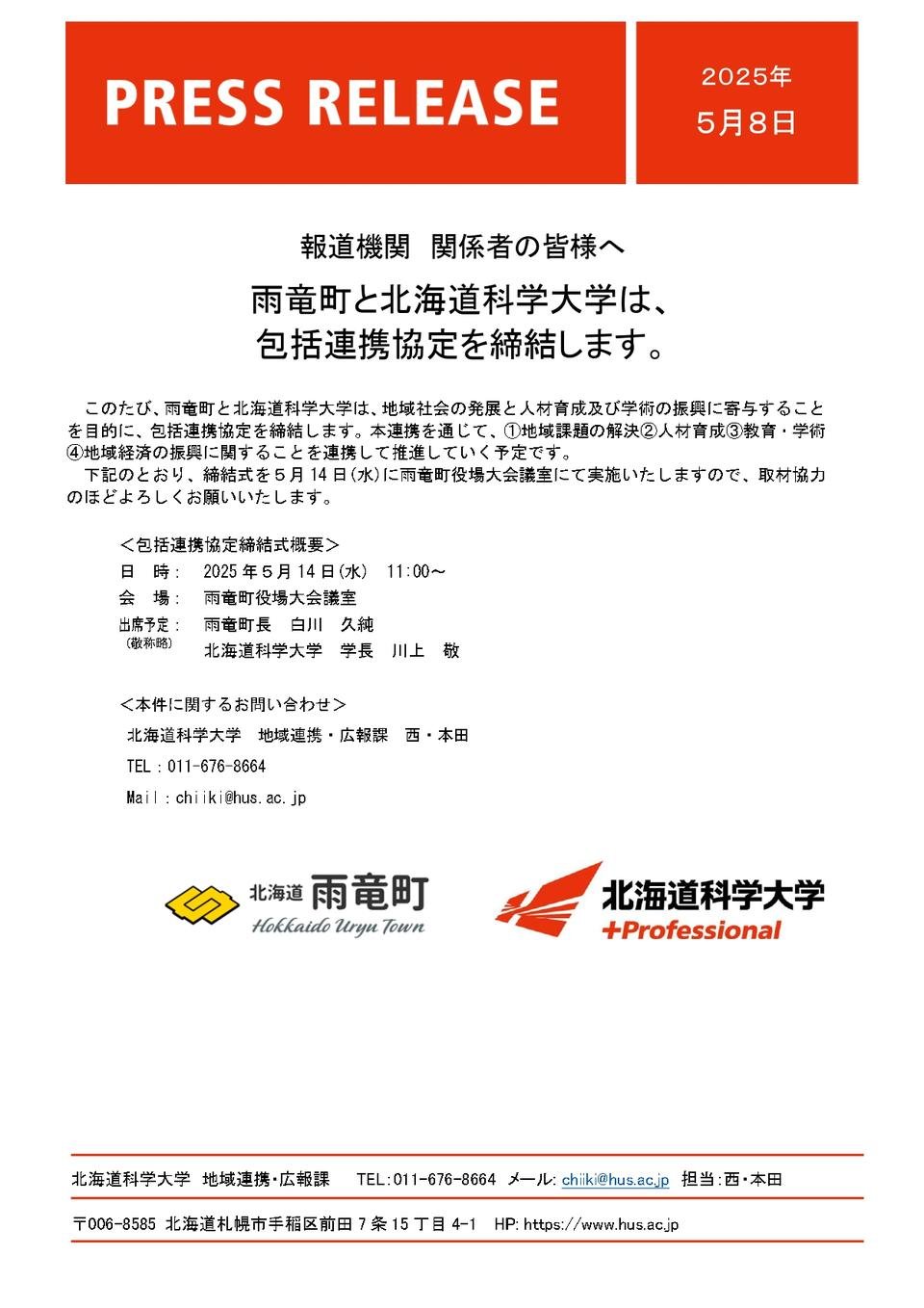 下記のとおり、締結式を5月14日(水)に雨竜町役場大会議室にて実施いたしますので、取材協力のほどよろしくお願いいたします。