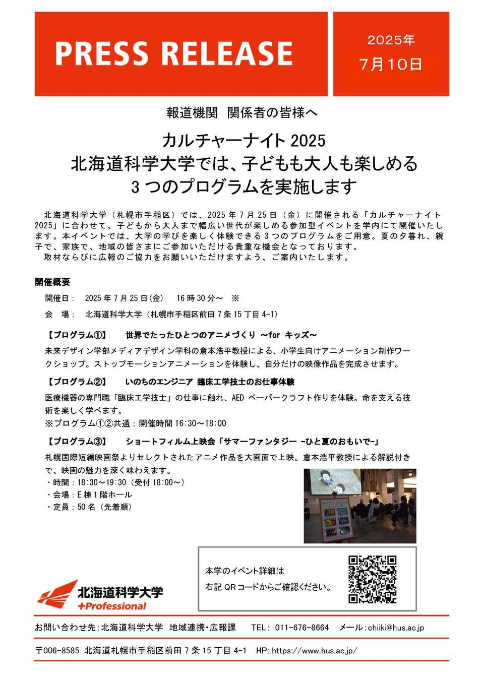 北海道科学大学は、2025年7月25日(金)に開催される「カルチャーナイト2025」に合わせて、子どもから大人まで幅広い世代が楽しめる参加型イベントを学内にて開催いたします。本イベントでは、大学の学びを楽しく体験できる3つのプログラムをご用意。夏の夕暮れ、親子で、家族で、地域の皆さまにご参加いただける貴重な機会となっております。