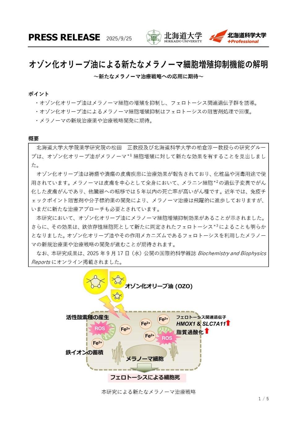 北海道大学大学院薬学研究院の松田 正教授及び北海道科学大学の柏倉淳一教授らの研究グループは、オゾン化オリーブ油がメラノーマ*1 細胞増殖に対して新たな効果を有することを見出しました。