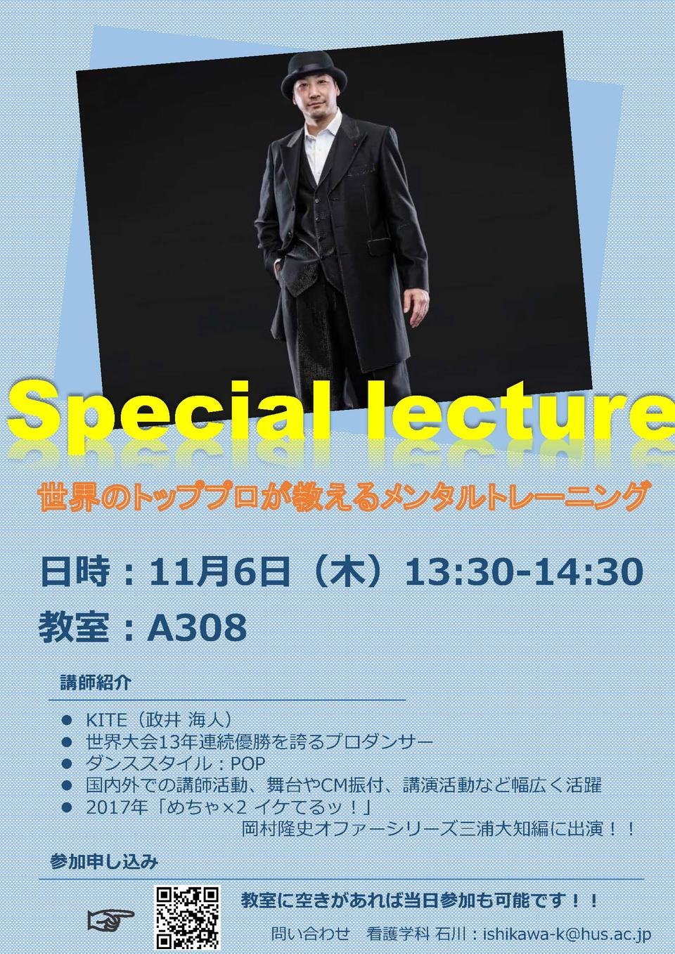 世界大会13年連続優勝を誇るプロダンサー KITE(カイト)氏 を招き、看護学科主催による特別講演会「世界のトッププロが教えるメンタルトレーニング」を開催します。