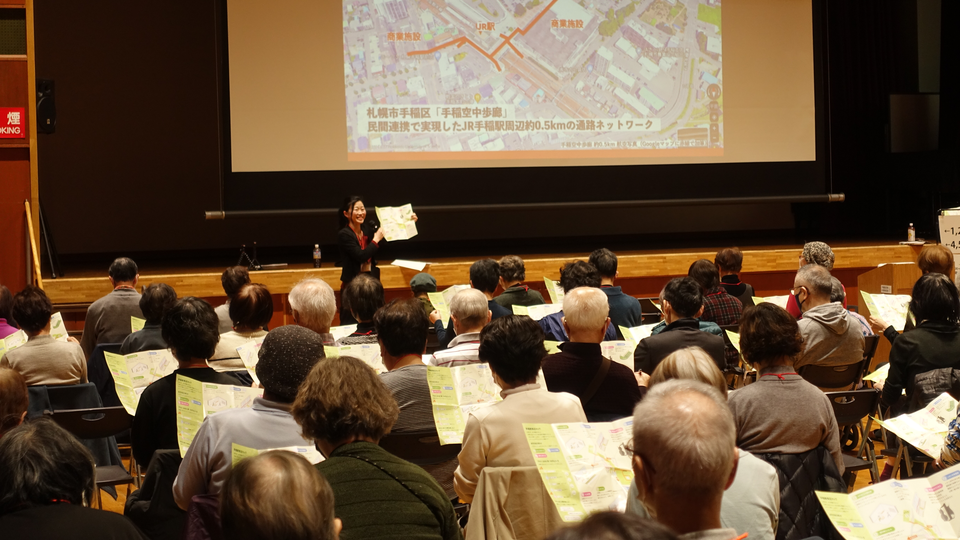 続いて、苗穂や新さっぽろなど、市内JR駅周辺のまちづくりにご尽力されている阿部 勇士氏(札幌市まちづくり政策局政策企画部政策推進課)より、札幌市が現在推進する「ウォーカブルシティ」政策についてご説明がありました。北海道の課題でもある健康寿命の改善、安全な歩行空間の確保、交流促進の観点、特に高齢者の冬季の外出率向上を目指す取り組みについて言及されました。