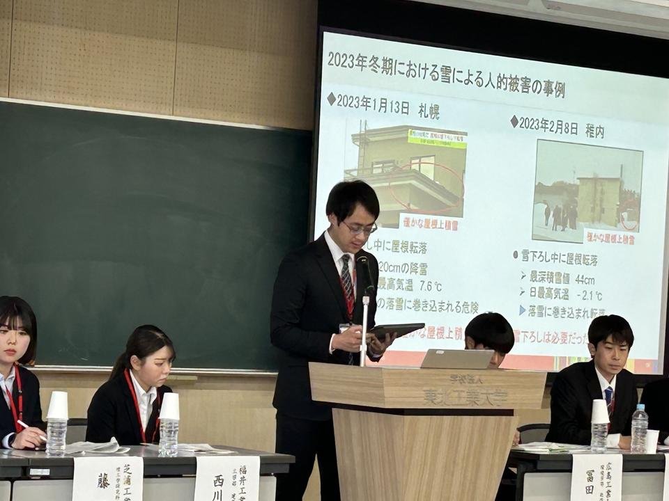 学生プレゼンテーションでは、大学院工学研究科建築学専攻修士1年 佐々木寛誠さんが「北海道における屋根の雪下ろしの必要性について」というテーマで、北海道で発生している屋根の雪下ろしによる事故の原因とその解決策についての研究内容が発表されました。