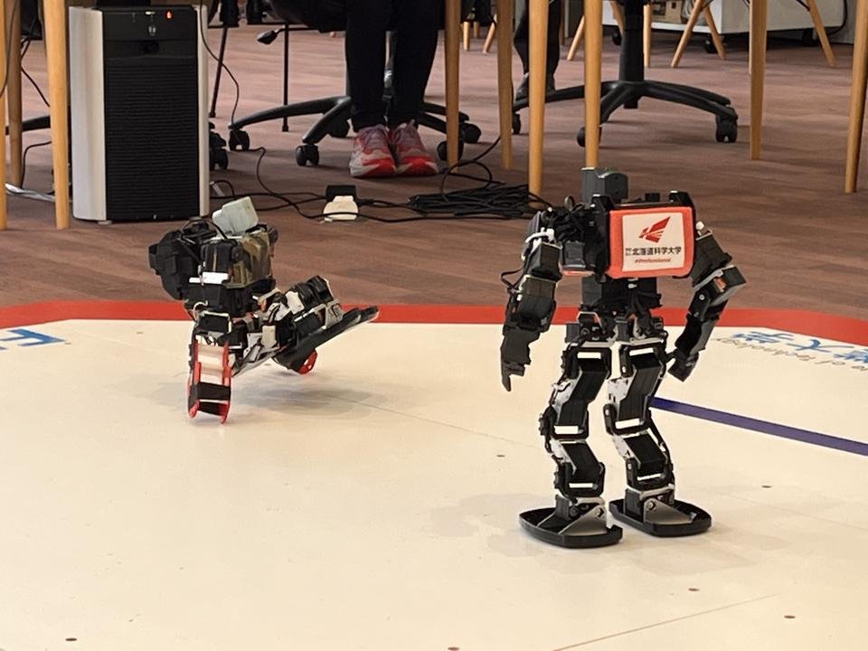 1つは「ロボットバトル」で、ロボット同士が戦うROBO-ONEと、障害物競走の2つの競技が行われました。本学からは、夢プロジェクトの学生団体「中型ヒューマノイドロボット製作プロジェクト」のメンバーである機械工学科の学生5名が参加し、ROBO-ONEでは1回戦を勝ち抜き、障害物競走ではなんと優勝しました!プロジェクトの皆さん、おめでとうございます。