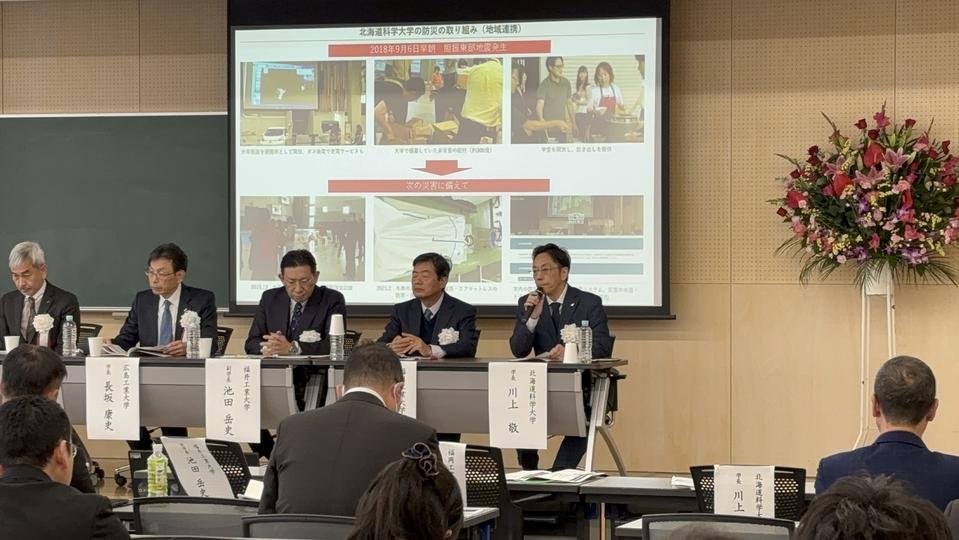 各大学の学長と学生からのプレゼンテーションでは、各地域特有の課題に即した研究や産学官民連携活動等の取り組みについて報告されました。本学の川上学長は、2018年に発生した胆振東部地震による大規模停電の際に本学がガス発電可能な施設を地域住民に開放したことや、非常食の配付等を行ったことによる地域貢献について説明し、冬季の災害に備えた取り組みを紹介しました。また、寒冷地特有の雪害に対して、寒地先端材料研究所が本学の「自然雪風洞試験装置」を用いて特色ある研究をしていることも紹介しました。