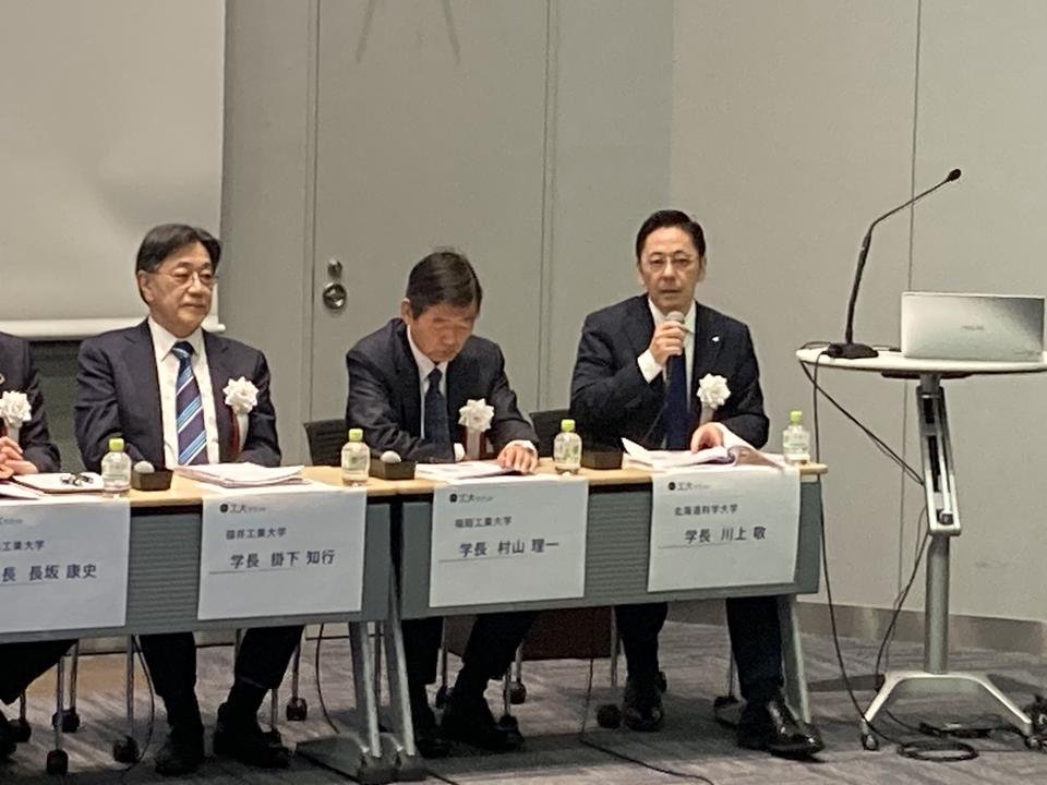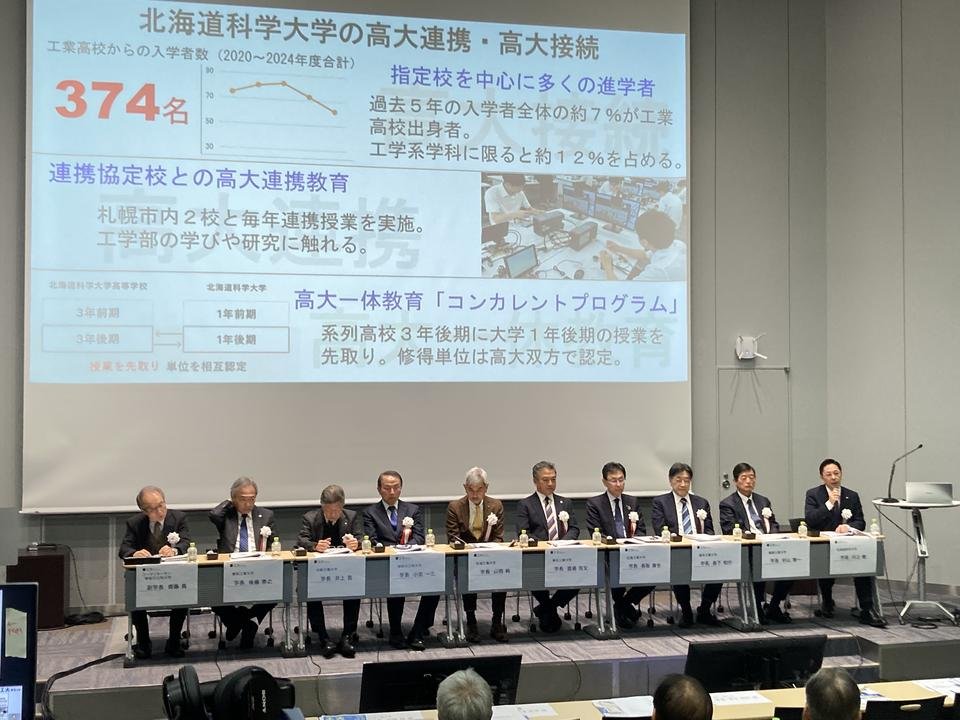 本学の川上学長は、本学における工業高校からの入学動向や近年の高大連携事業など工業高校に関する実績について紹介し、加えて道内の公立工業高校の教員(担当教科 工業・情報)のうち約4割が本学出身者であることや小中高生向けに実験・体験講座を多数開催するなど工学分野の発展に貢献していることも説明されました。