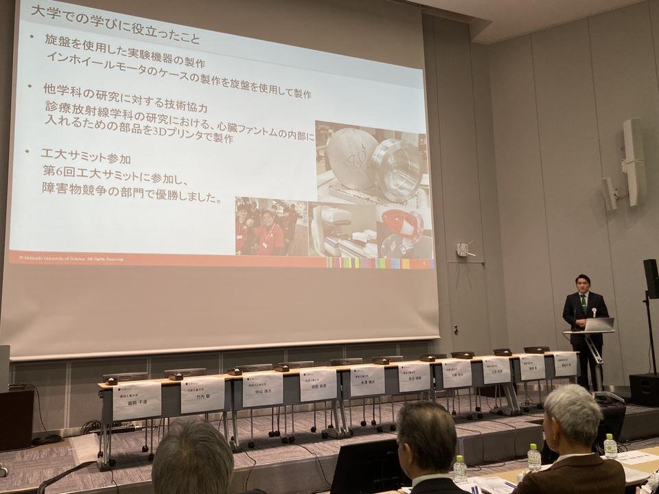 分科会Aでは、機械工学科4年 栗谷川宙さんが「工業高校の基礎から大学工学部の実践と理論の学び~工業高校教員を目指して~」というテーマで、工業高校での学びと大学での学び、卒業後採用となる工業高校教員としての抱負について堂々と発表されました。