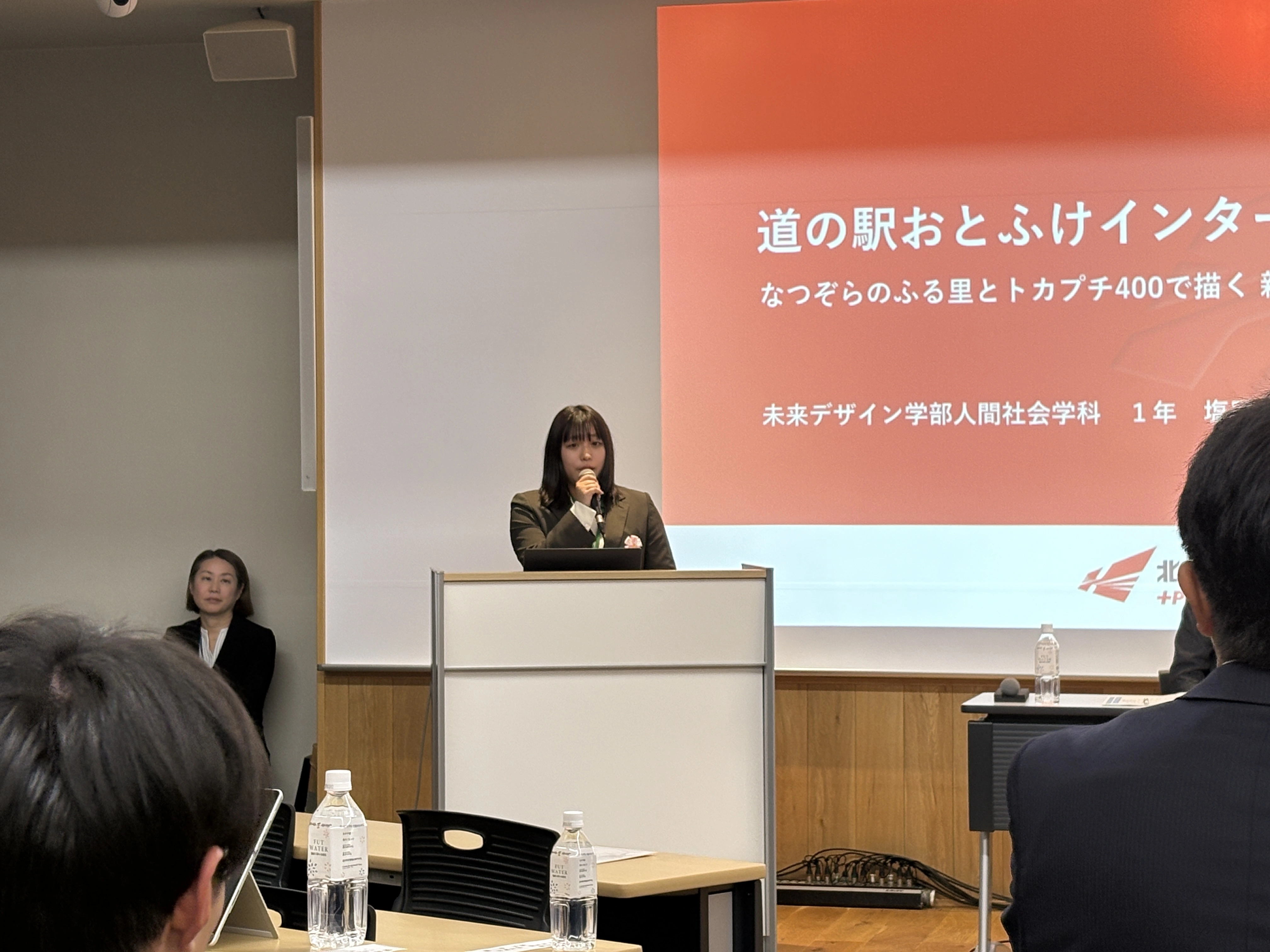学生プレゼンテーションでは、本学の塩口七海さん(人間社会学科 1年)が「道の駅おとふけインターン活動報告」というテーマで、地域課題解決を目的としたご自身の取組みを堂々と発表されました。