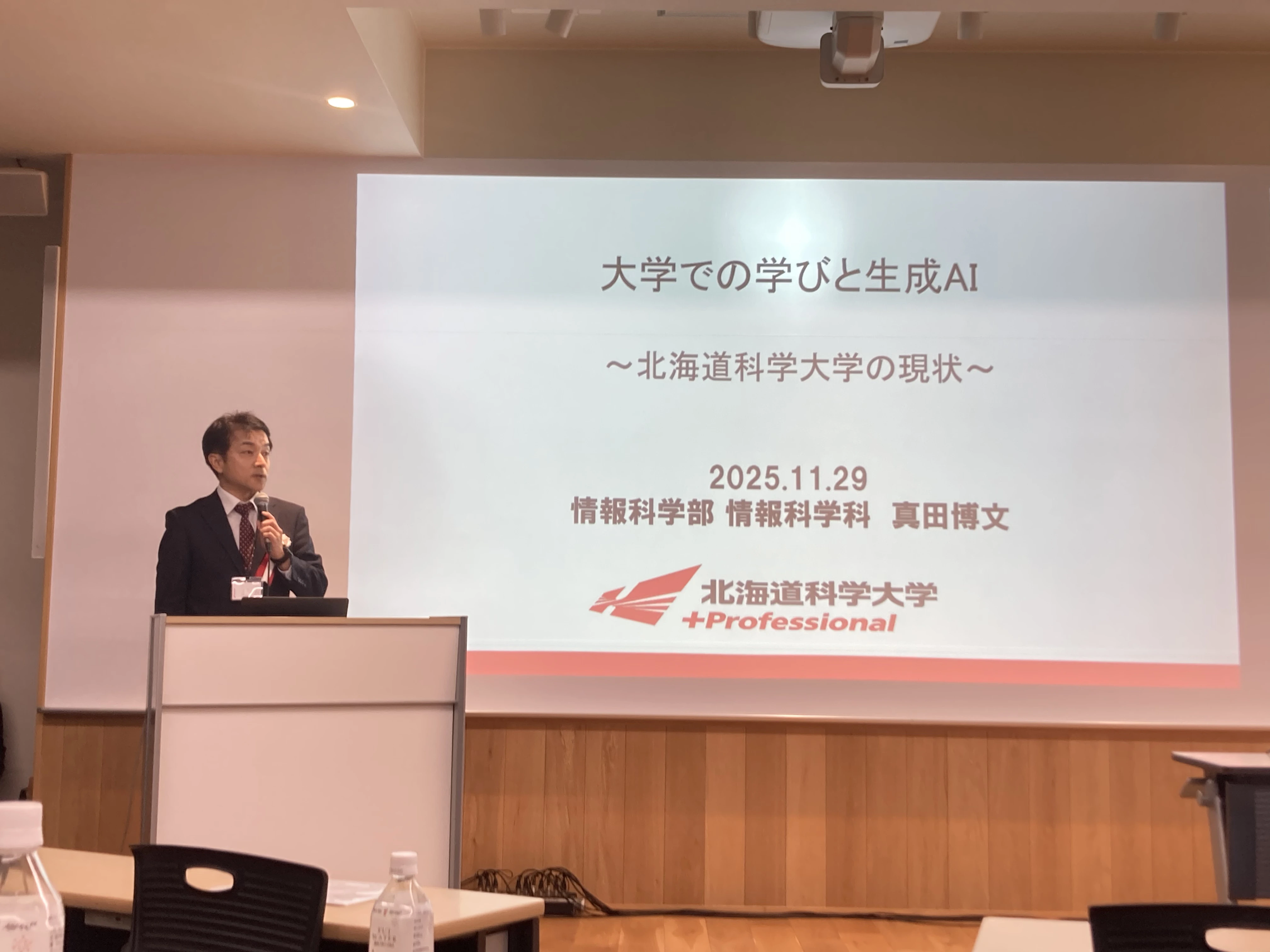 第2部では「生成AIの教育研究への活用」というテーマで各大学の事例発表が行われ、本学からは真田博文副学長が「大学での学びと生成AI~北海道科学大学の現状~」と題して、本学における教員の生成AIに関する意識調査の結果と活用事例について発表されました。