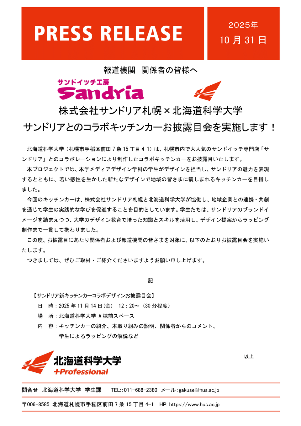 株式会社サンドリア札幌×北海道科学大学 サンドリアとのコラボキッチンカーお披露目会を実施します!|プレスリリース