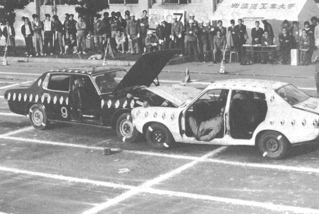 1980(昭和55)年10月、北海道工業大学(現 北海道科学大学)2号館前の特設実験コースにて、公開自動車衝突実験が行われました。