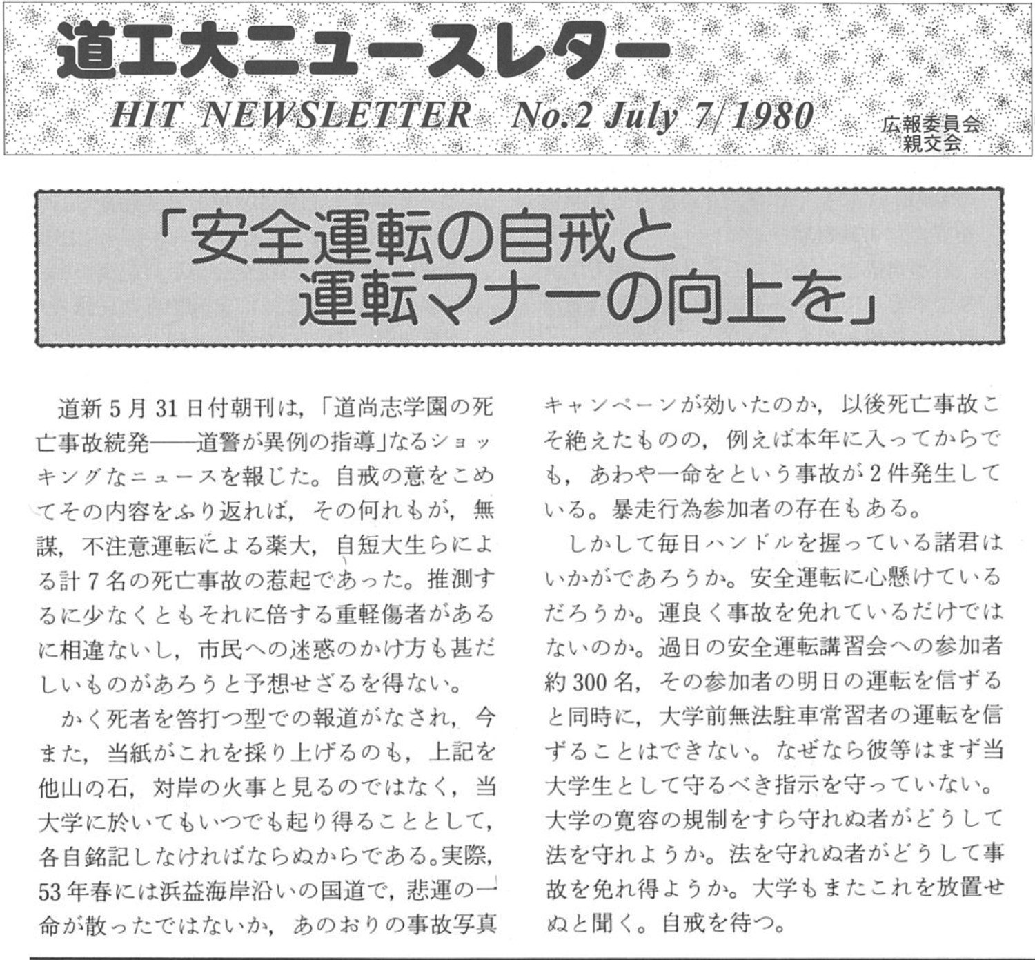 前年1979年には、大学生のマイカー通学急増問題について本学を例に挙げて特集した新聞報道がされ、本学ニュースレターでも運転マナー向上を呼び掛ける記事が見られるようになりました。