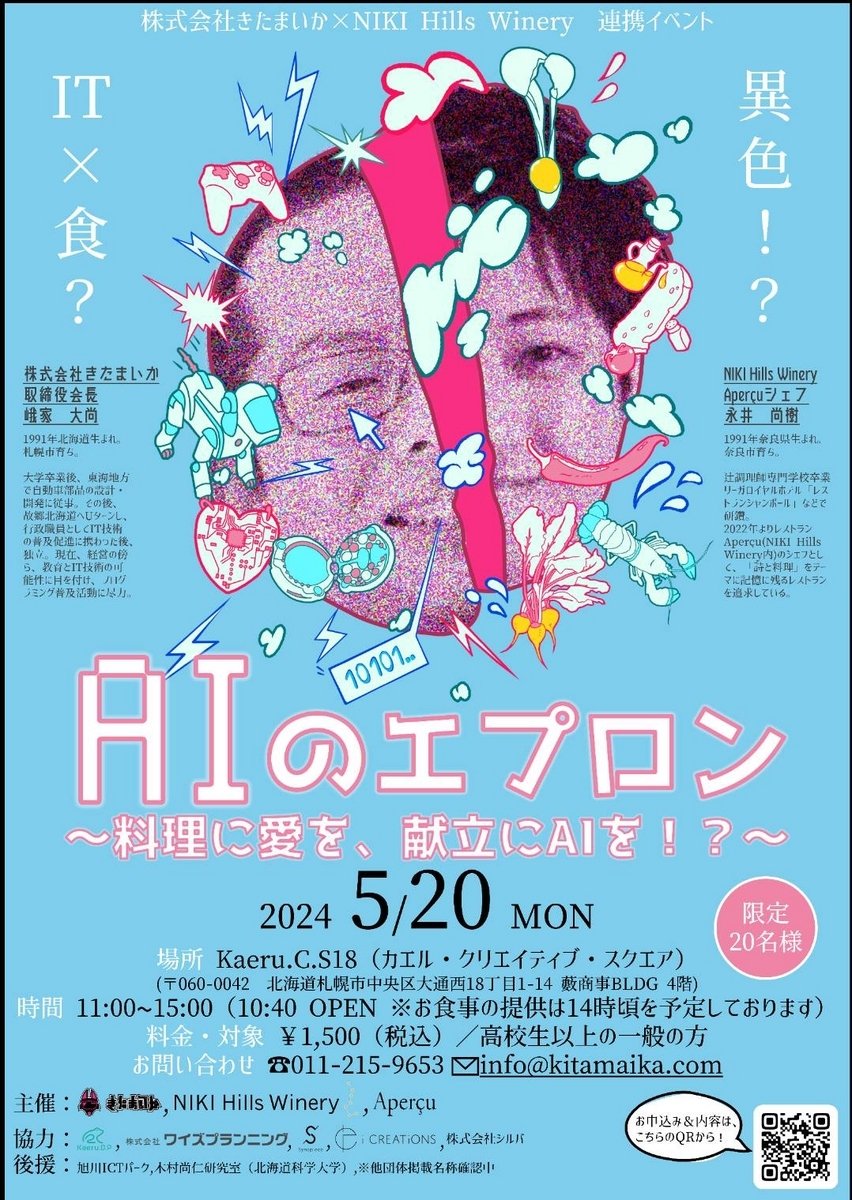 究極のアナログである料理と、究極の先端技術である《AI》技術をコラボレーションさせる、「(株)きたまいか」と「NIKI Hills Winery」連携によるイベント、「AIのエプロン〜料理に愛を、献立にAIを!?〜」が開催されます。