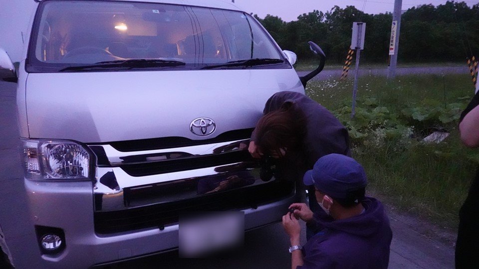 取材ではまず、車に笛を付けていない状態で鹿の付近を走行させ、続いて笛を取り付けて走行。