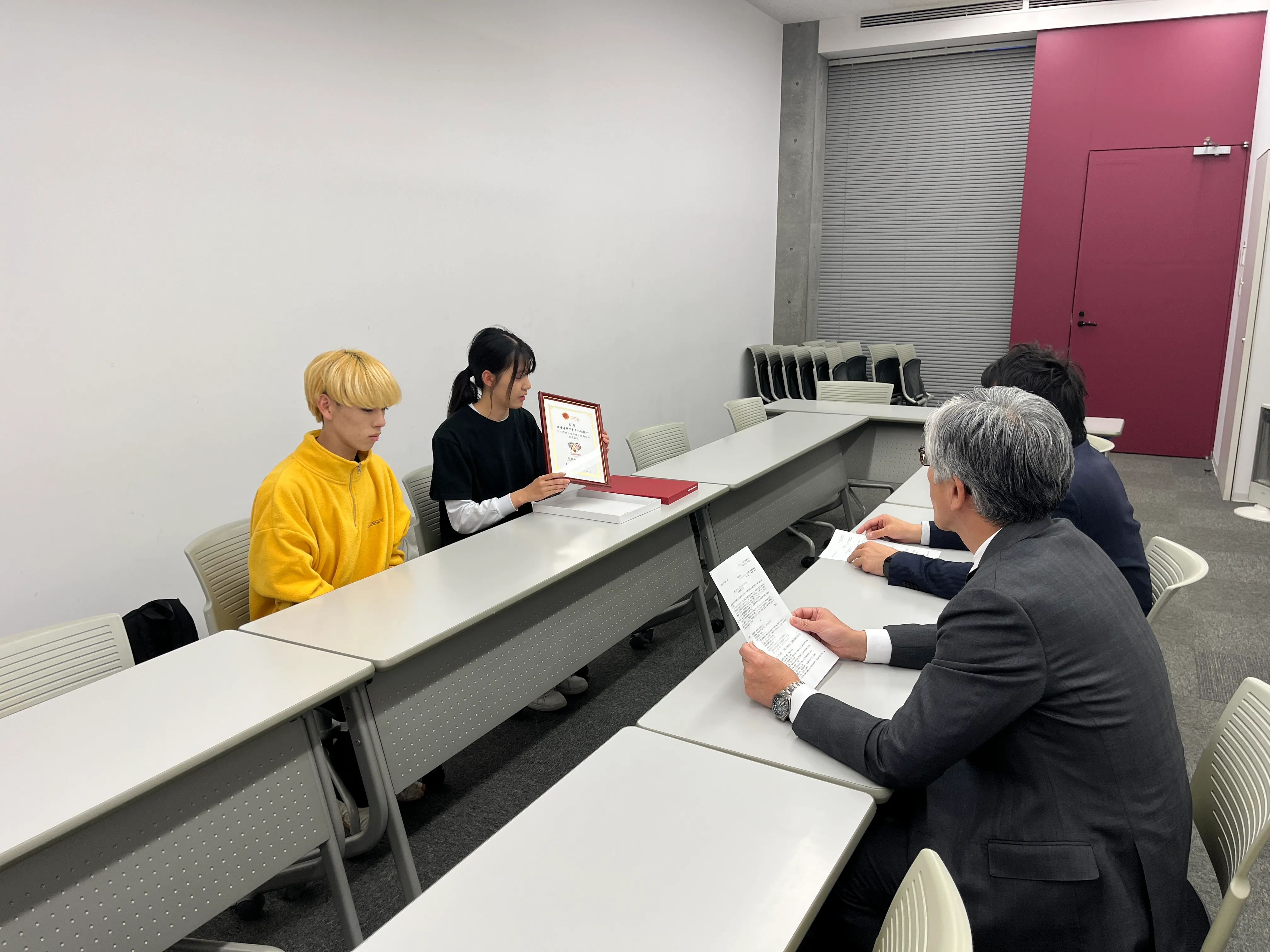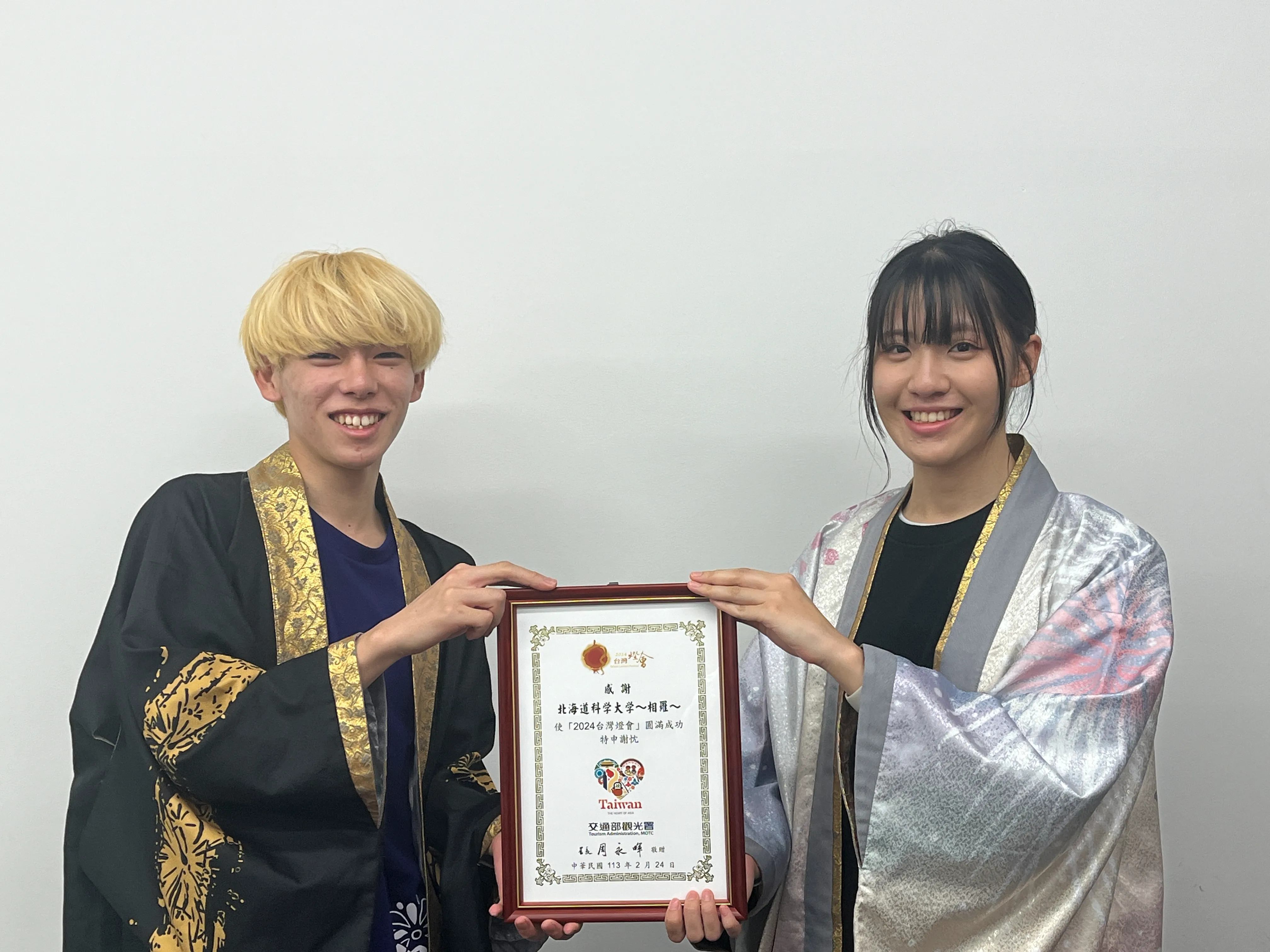 先日、現地のお祭りを盛り上げ、台湾交通部観光局から感謝状をいただいたとの旨を大学に報告してくれました。