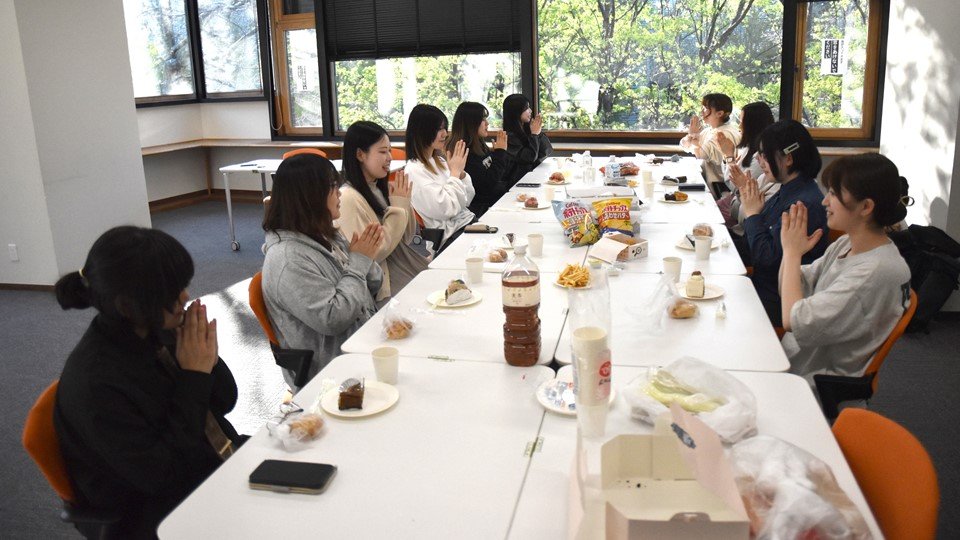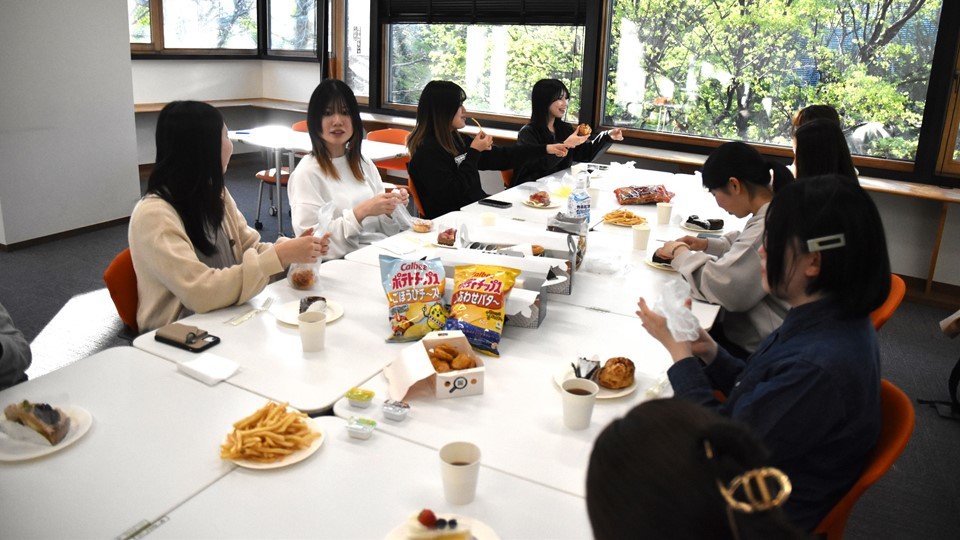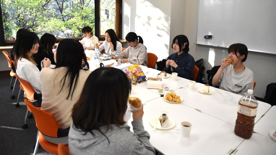 女子会では持ち寄ったケーキやドーナツを食べながら、教員のこと、授業のこと、部活動のことなど、新入生が気になっていることや、どこの高校出身なの? 部活やってた? といった話題で盛り上がり、学年を超えた大変楽しい交流会となりました!