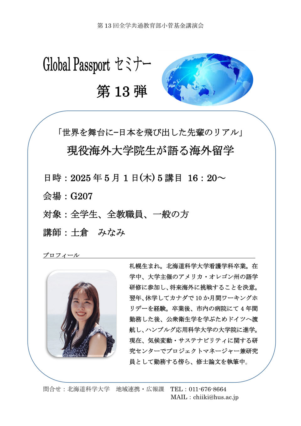 2025年5月1日(木)、公開講座「『世界を舞台に-日本を飛び出した先輩のリアル』現役海外大学院生が語る海外留学」を開講します。