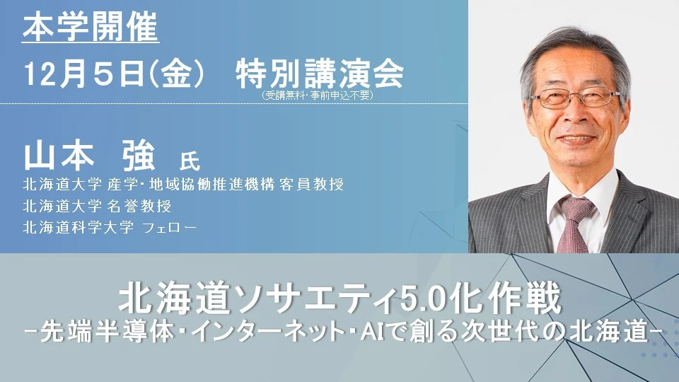 本学のフェローでもある山本強氏をお招きし、「北海道ソサエティ5.0化作戦 -先端半導体・インターネット・AIで創る次世代の北海道-」をテーマに特別講演会を開催します。