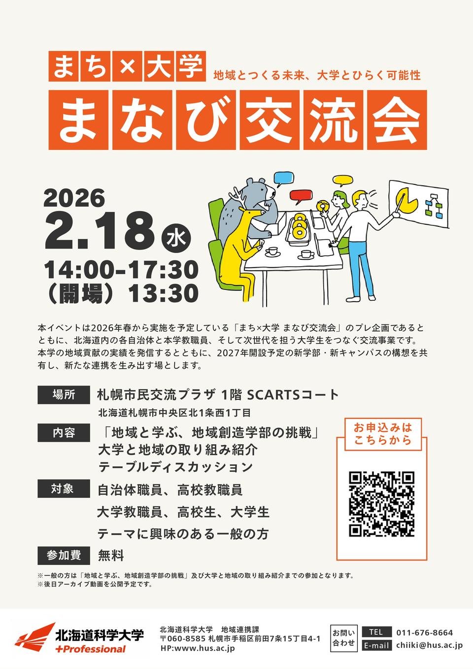 2026年2月18日(水)14:00から、札幌市民交流プラザ 1階 SCARTSコートにて、「まち✕大学 まなび交流会 第0回 ~地域とつくる未来、 大学とひらく可能性~」 を開催します。