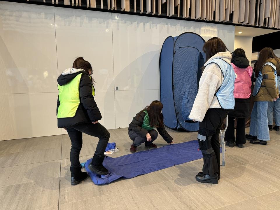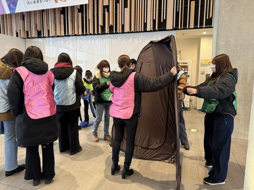 避難訓練終了後、E棟ホールで停電を想定した避難所開設訓練を実施しました。