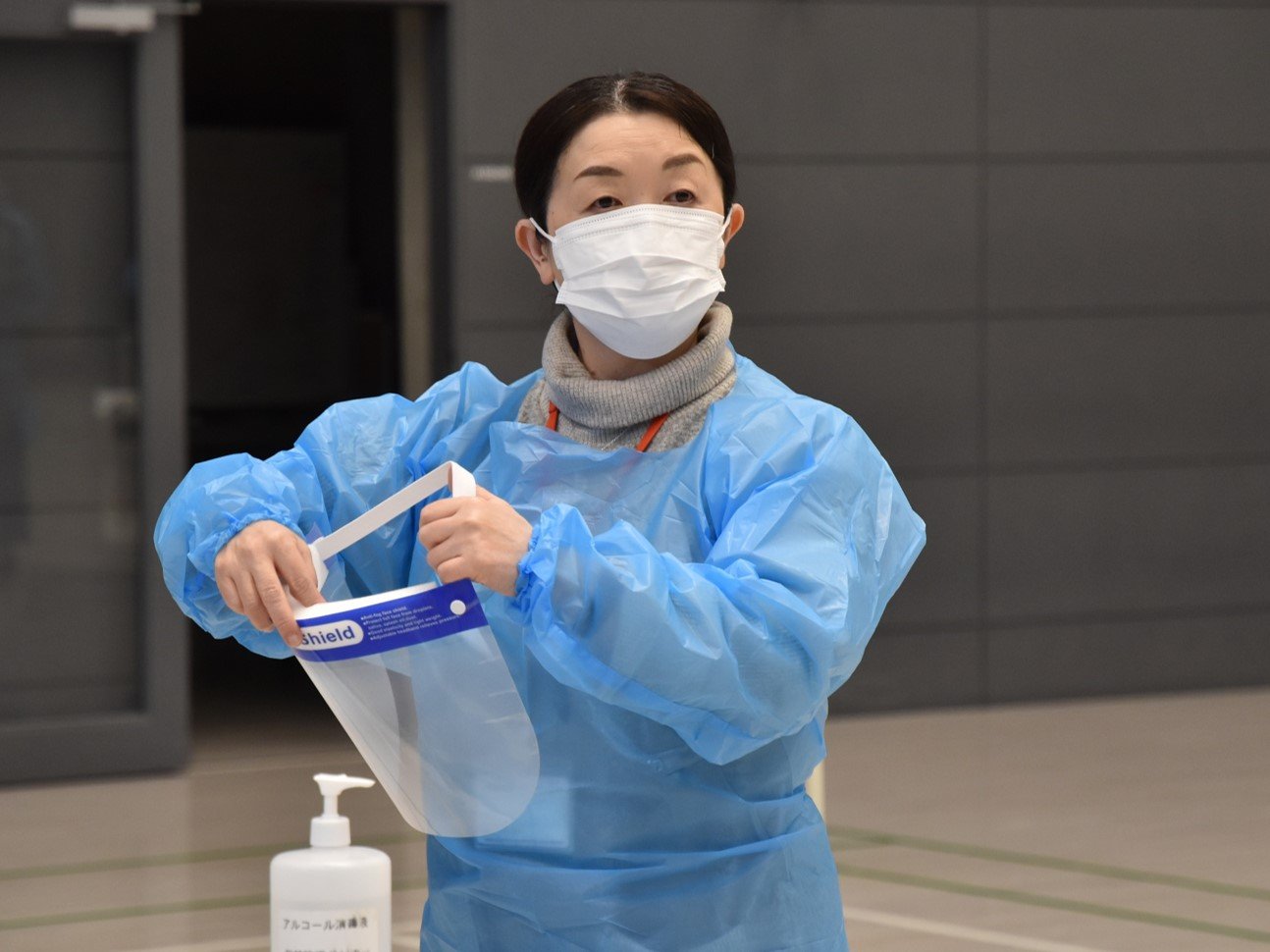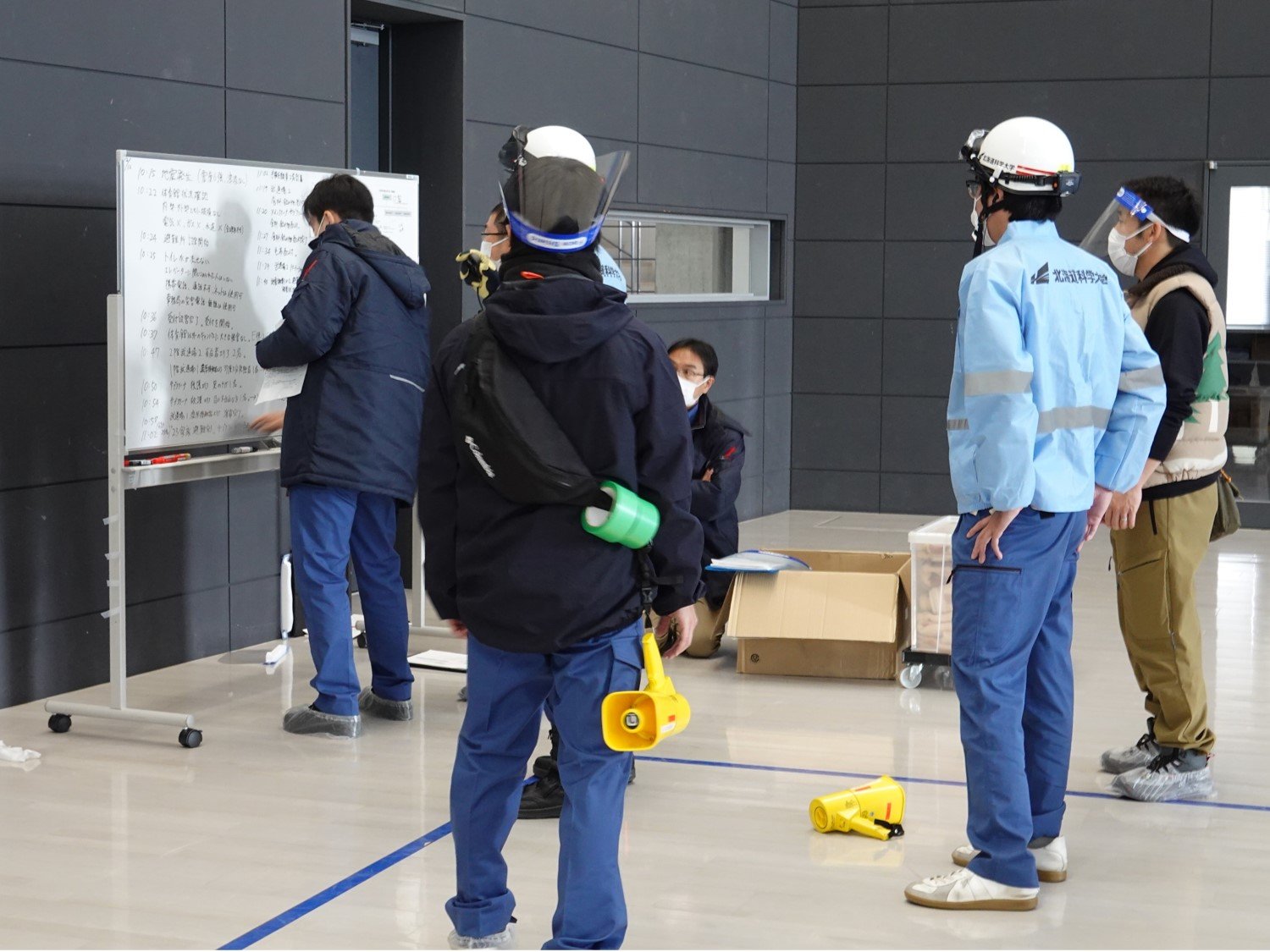 厳冬期に震度6強の地震が発生し、札幌市全域においてライフライン(電気・ガス・水道)が断たれたという想定で開始されたこの訓練では、受付時の検温、発熱者や濃厚接触者は別ルートで体育館へ入館案内するなど、新型コロナウイルス感染症対策を講じた避難所開設の手順について確認しました。