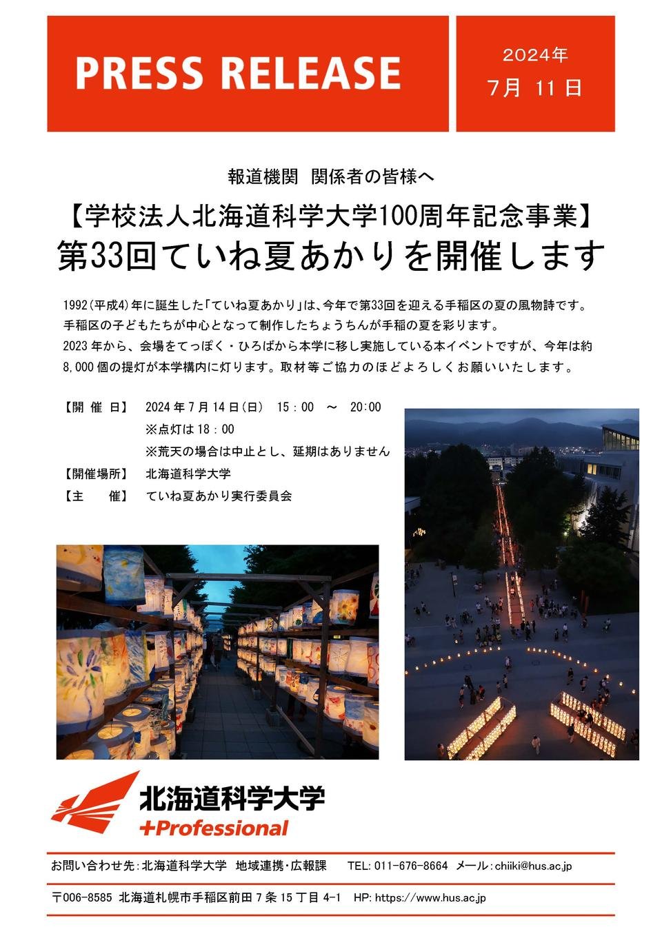 【学校法人北海道科学大学100周年記念事業】 第33回ていね夏あかりを開催します