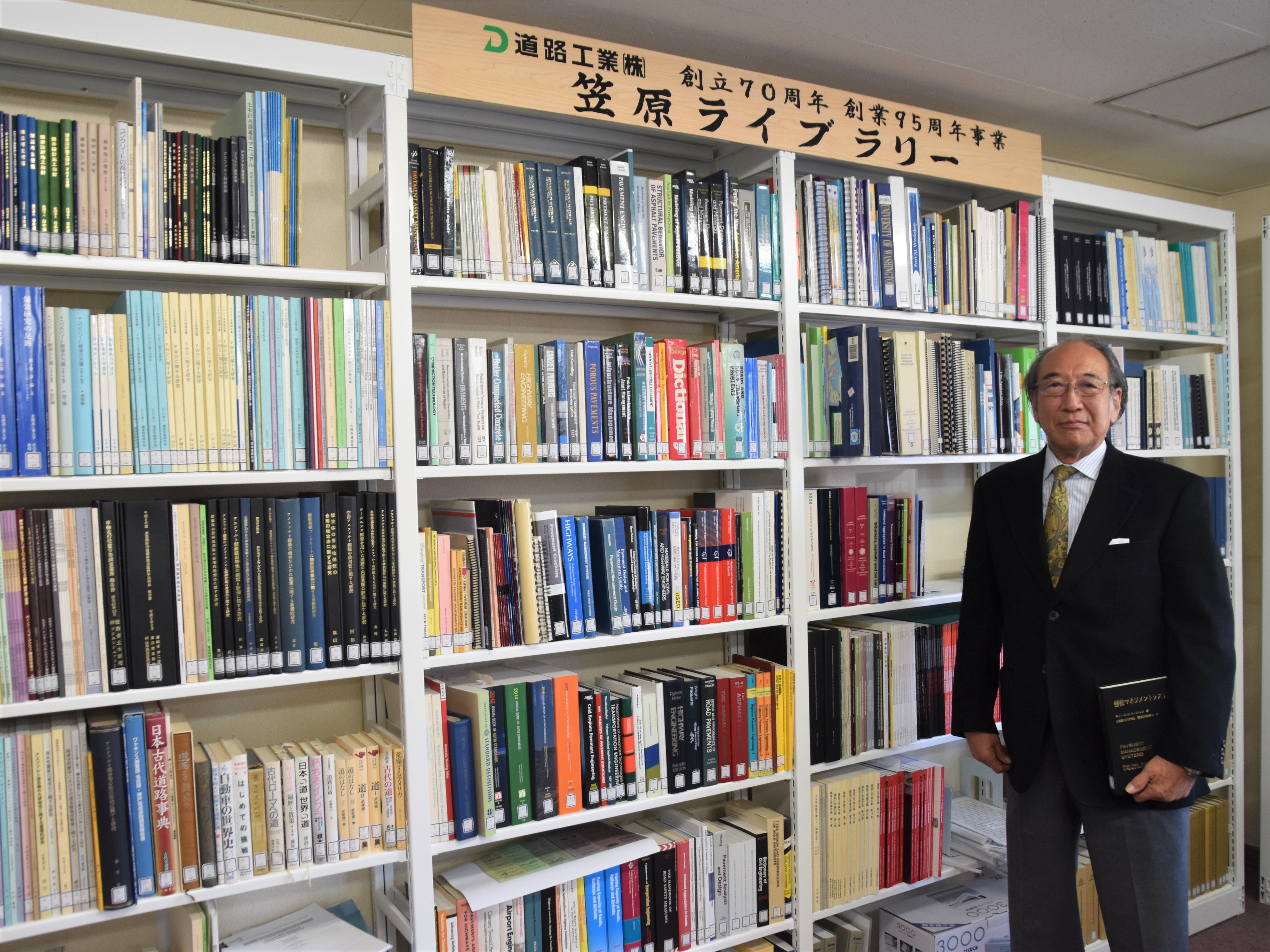 事務所には、2019年に会社の創立70周年・創業95周年を記念して「笠原ライブラリー」が設けられ、先生が寄贈した道路関係の書籍や研究論文が所蔵されています。