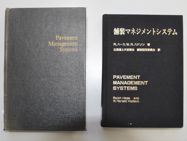 写真の「舗装マネジメントシステム」は、留学先のウォータールー大学のR.ハース教授とW.R.ハドソン教授が1978年に刊行した洋書を、笠原先生が所属する北海道土木技術会舗装研究委員会が1989年に日本語翻訳したものです。