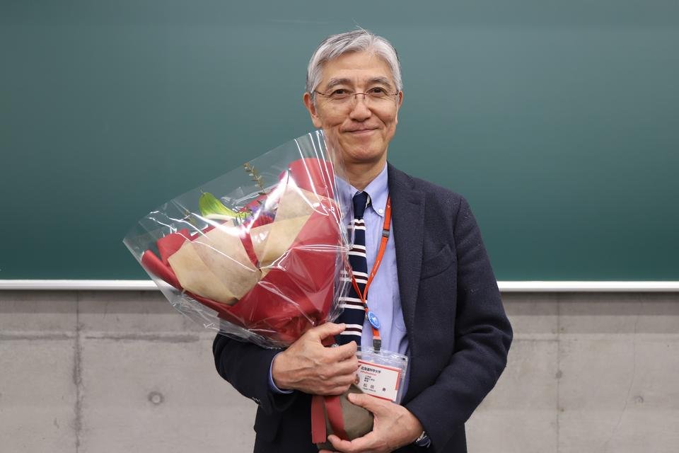 この日は教職員や在学生、そして多数の卒業生が聴講に訪れ、講義後は花束が松田教授に贈られました。