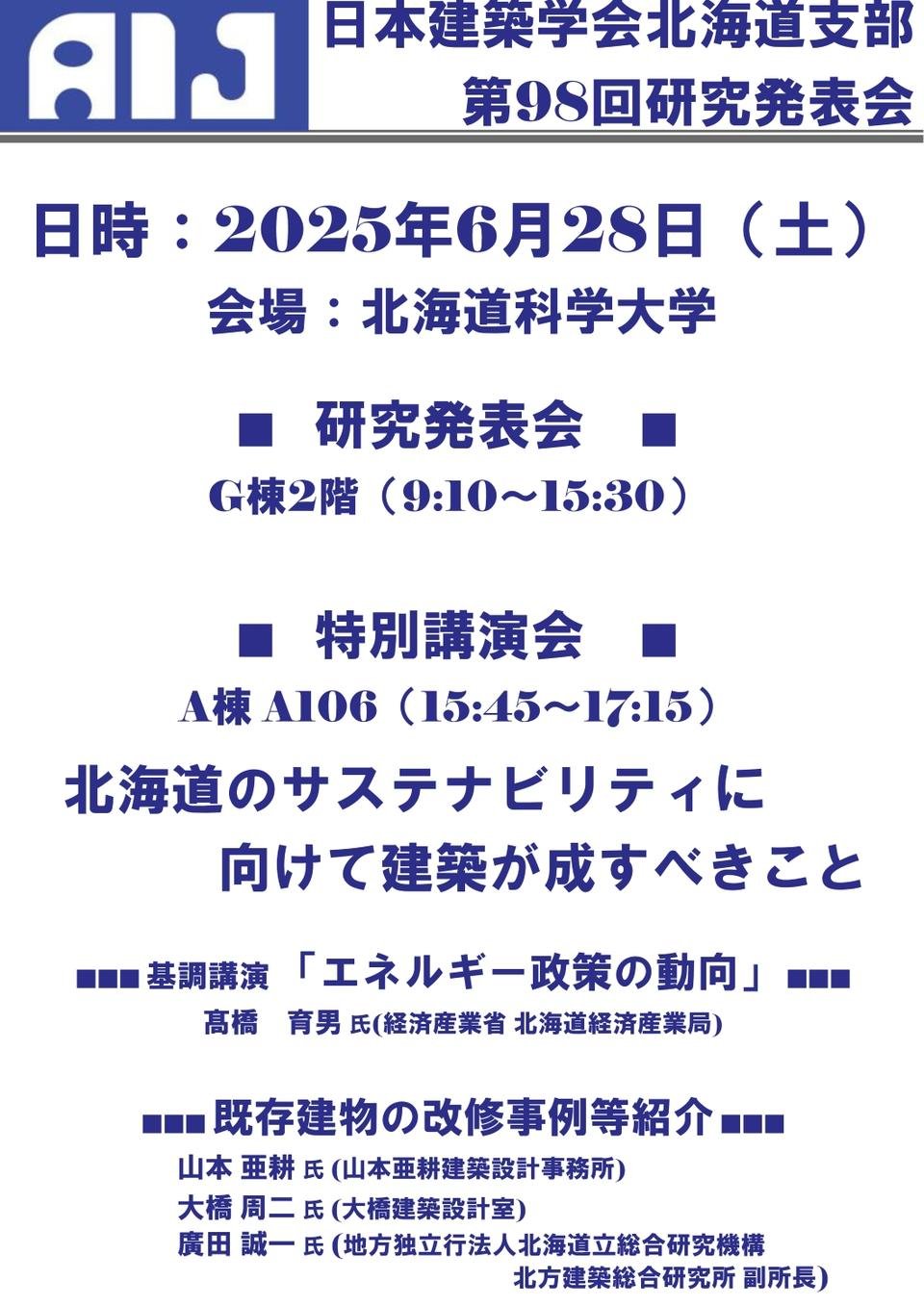 工学部教員・研究2025年06月27日2025年6月28日(土)に【日本建築学会北海道支部第98回研究発表会】が本学で開催されますこちらをクリックするとPDFが開きますPDF開催概要開 催 日 :2025年 6月 28日(土)開 催 方 式 :オンサイト(北海道科学大学)で実施ホ ス ト :北海道科学大学(〒006-8585 札幌市⼿稲区前⽥7条15丁⽬4-1)※詳しくはこちらをご覧くださいプログラム興味を持ったら・・・建築学科日本建築学会 北海道支部北海道支部研究発表会この記事をSNSでシェアXでシェアするLINEでシェアする