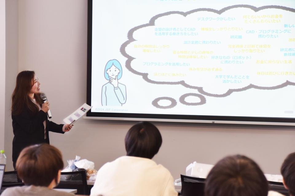2024年11月15日(金)、機械工学科2年「機械材料Ⅱ」の授業で、株式会社JSP 江原 伸行 様・米内山 元 様(本学卒業生)・三田 春奈 様・古川 優里菜 様によるマテリアル講話会が開講されました。