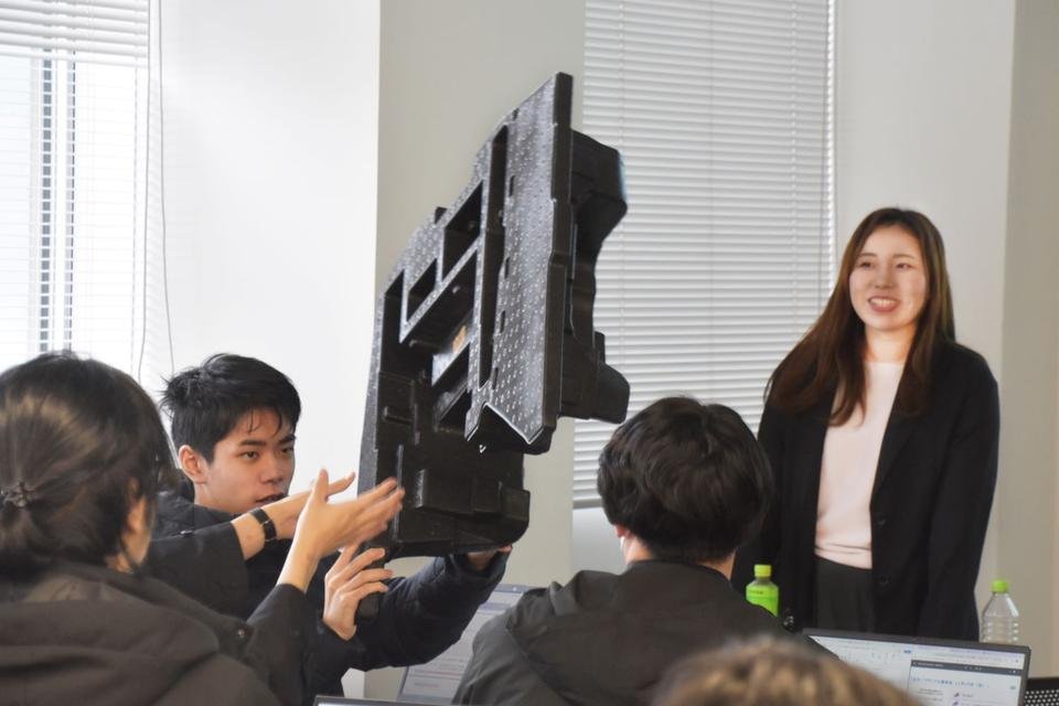 ⽶内⼭様には「プラスチック」の種類や製法といった基礎知識、会社概要、ご自身の仕事内容など詳しくお話していただきました。学生たちは、お持ちいただいた種々の発泡プラスチック製品や素材に触れ、感触や強度の違いを実際に確認していました。