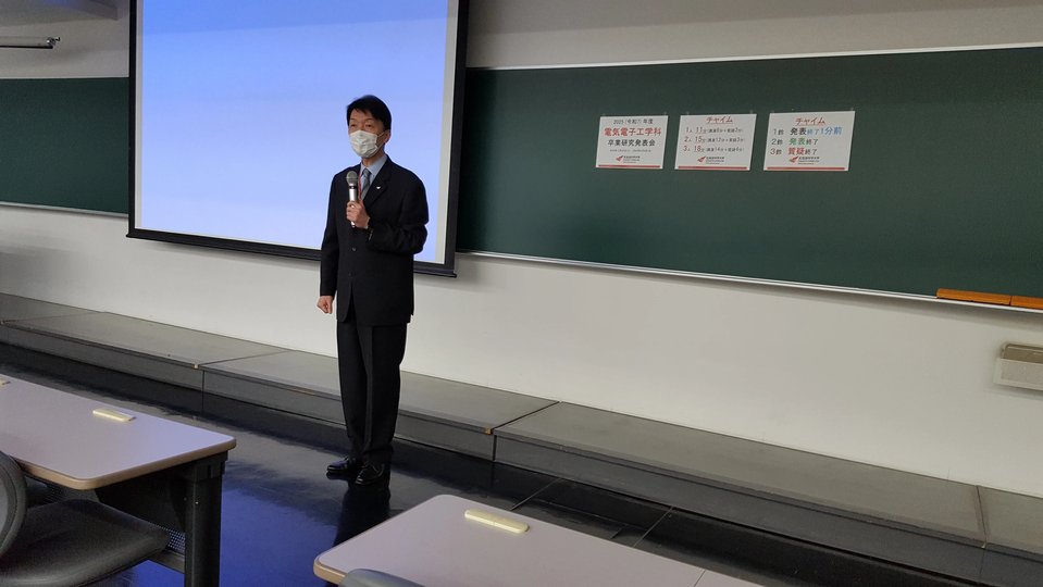 開会にあたり、工学部電気電子工学科の学科長 小島 洋一郎教授より4年生への激励の言葉が送られ、その後、卒業研究発表会の趣旨と進行について説明が行われました。